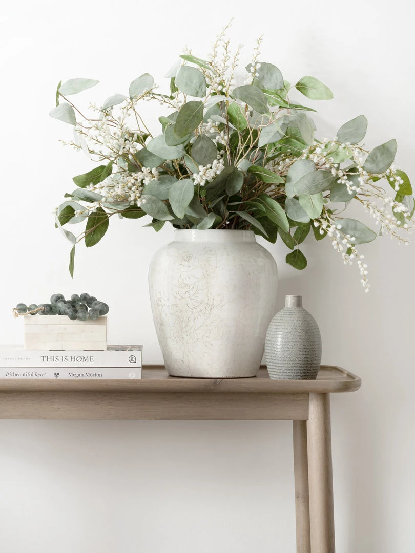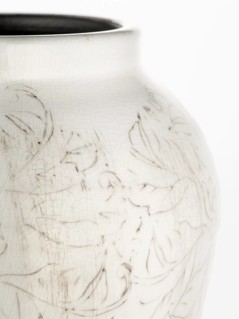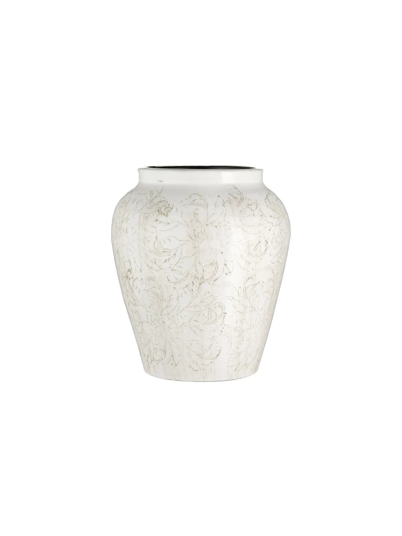 Large terracotta vase with a off-white crackle glaze and a delicate floral design in subtle tones of brown. Beautifully proportioned, a statement vase; fill with tall foliage, we recommend our silver dollar eucaluptus.