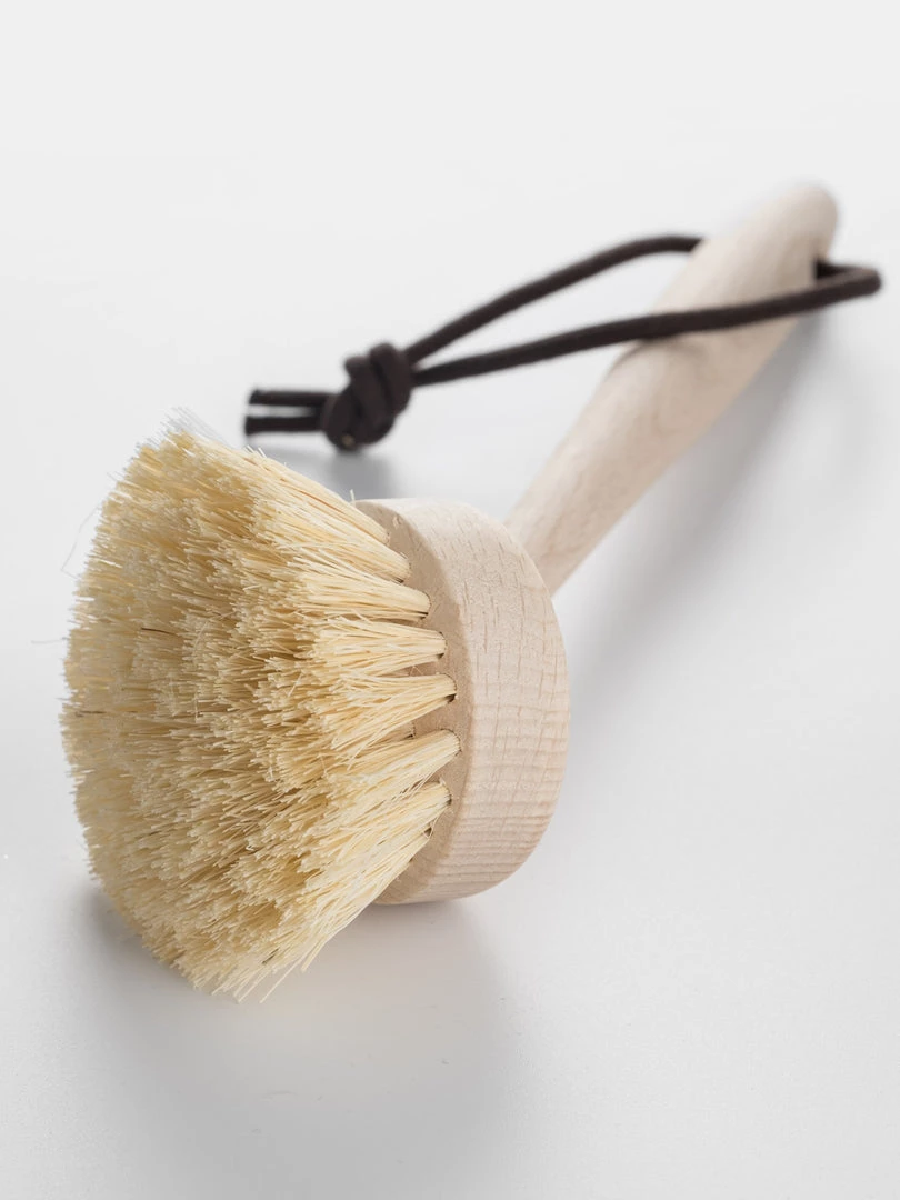 Andree Jardin beech dishwashing brush with plant fibre bristles and a cotton brown tie handle.
