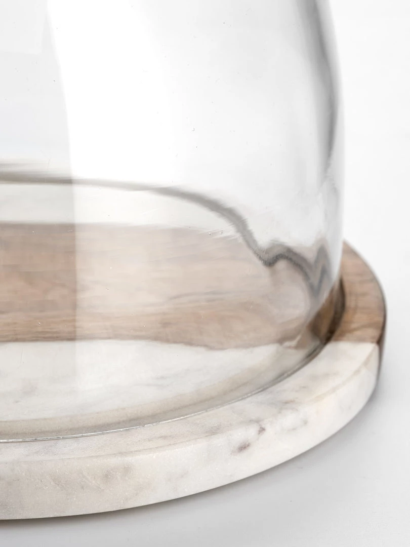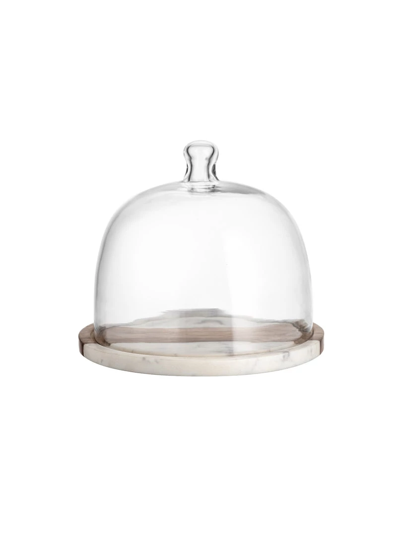 Impress your guests with this ultimate cheese stand, a white marble and wood base with a glass cloche cover.