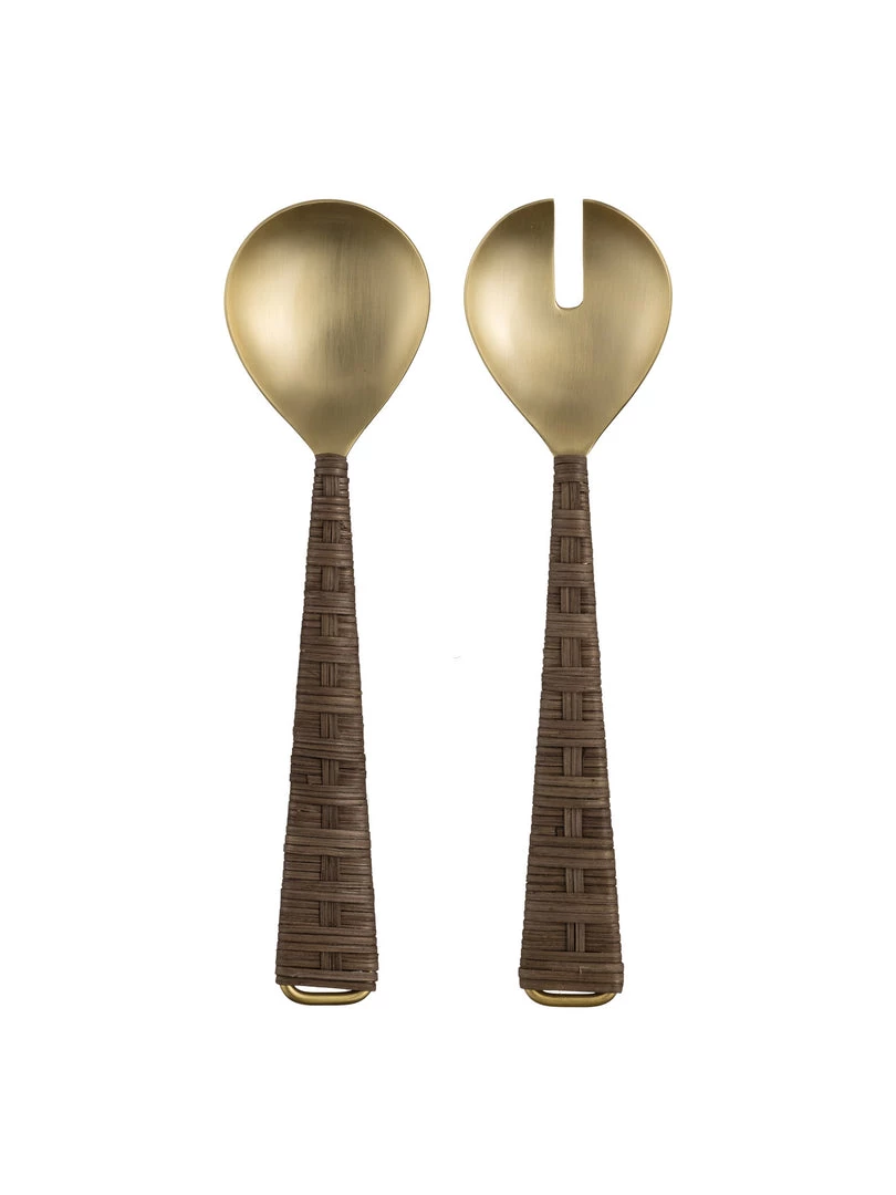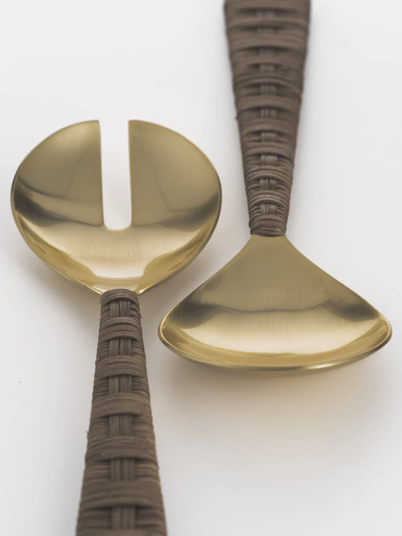 Elevate your diner parties with these beautiful brushed gold serving set wrapped in rattan. Natural but with a sophisticated twist.