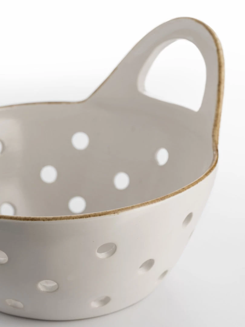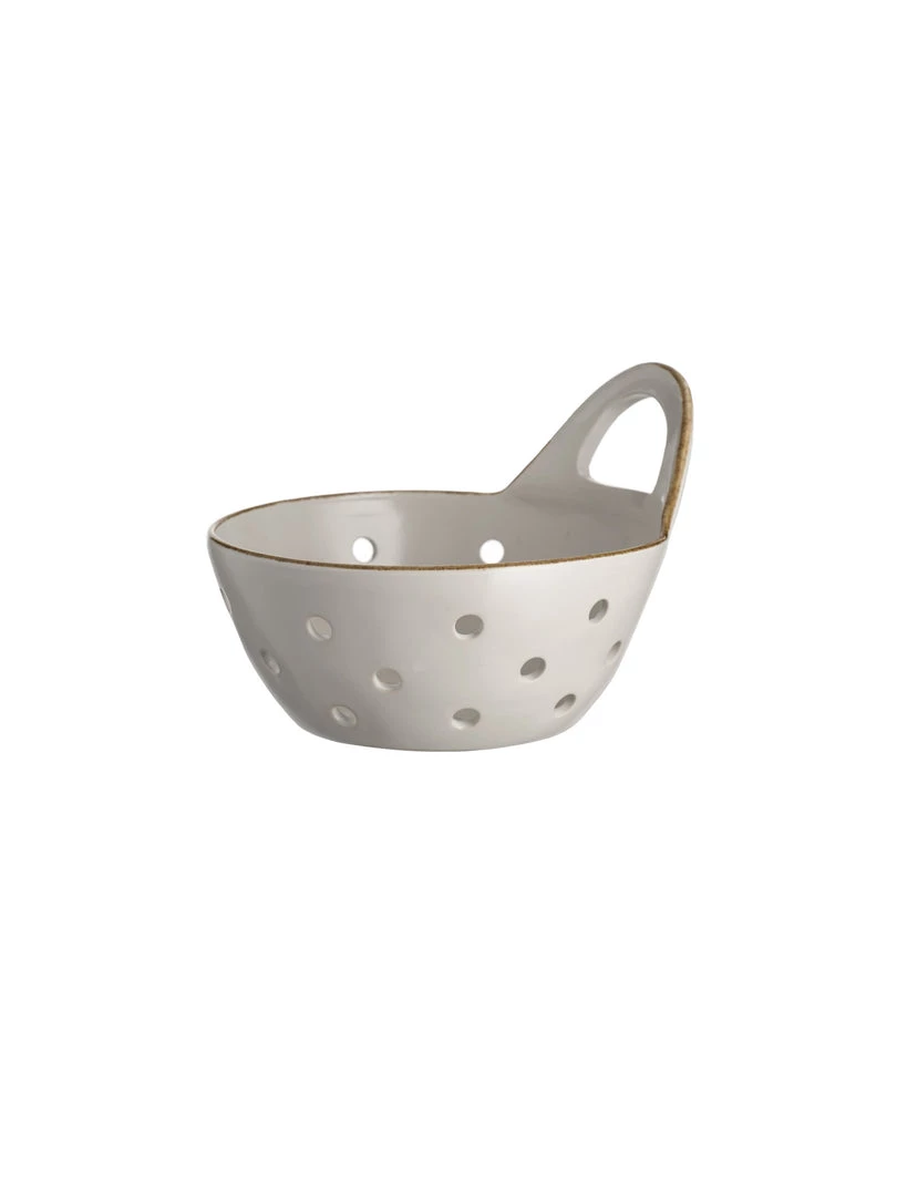 The stoneware colander basket with handle is the perfect way to rinse berries or display fruit. The sturdy stoneware construction is durable and easy to clean, while the attractive design makes it a great addition to any kitchen.