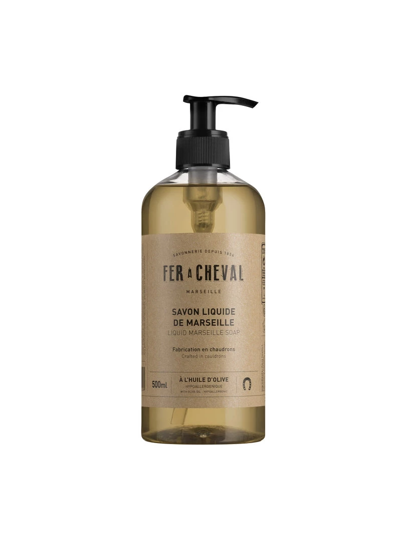 Enriched with olive oil known for its nourishing properties, Fer à Cheval liquid Marseille soap preserves the skin’s balance. Ideal for hand and body wash, it gently foams and cleanses, leaving a pleasant olive frangrance. A hypoallergenic formula, it does not contain any petrochemical surfactants, paraben or preservatives.