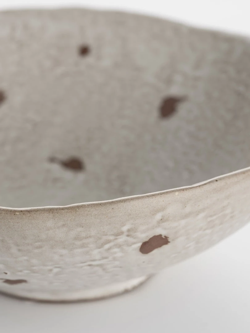 Organic shaped small bowl in shades of grey and white with parts of the glaze missing giving it this eclectic spotty design.