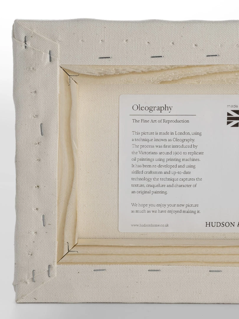 Oleographs are prints designed to resemble oil paintings in style, with close similarities to the artistic techniques of oil paintings. It’s a process first introduced by the Victorians around 1900 to replicate oil paintings using printing machines. It has been re-developed and using skilled craftsman and up-to-date technology.  The technique captures the texture, craquelure and character of an original painting.