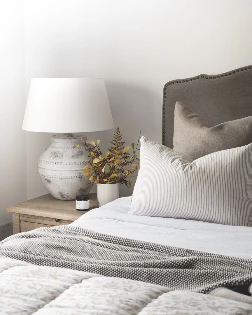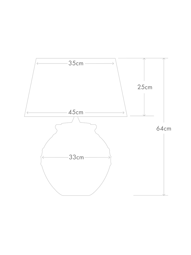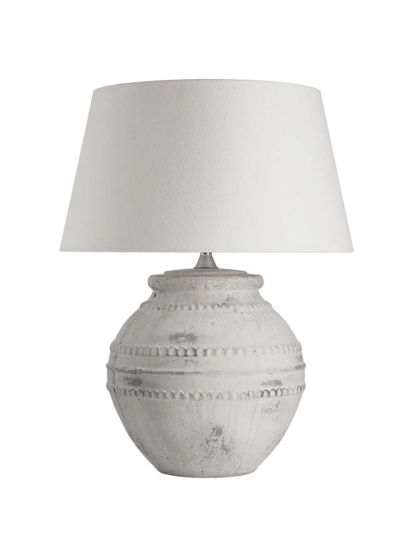 Our artisan inspired table lamp is reminiscent of a rustic pot with a weathered rustic pattina. The terracotta base has a white wash over a classic pattern, its earthy elegance is finished with a crisp linen shade in an off white/cream.