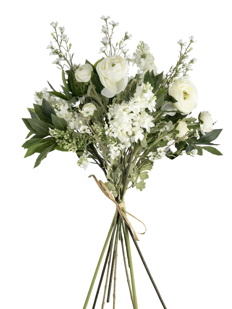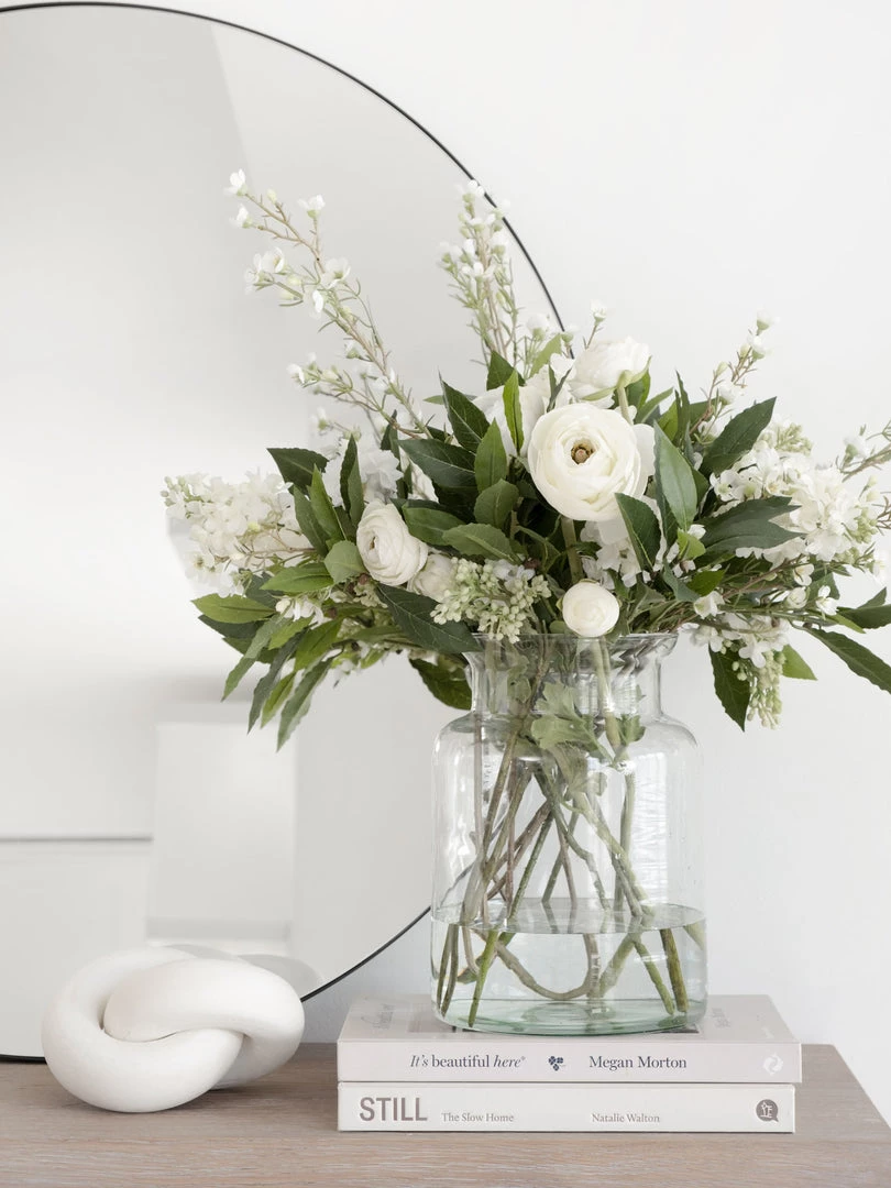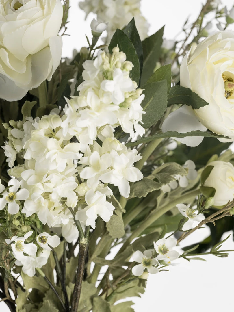 The essential summer arrangement, Mediterranean inspired with dusty green olive stems mixed in with a selection of beautiful white blooms and wax flowers. A summer arrangement that will last.