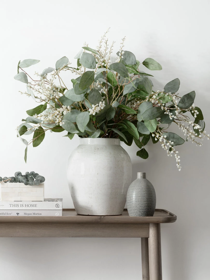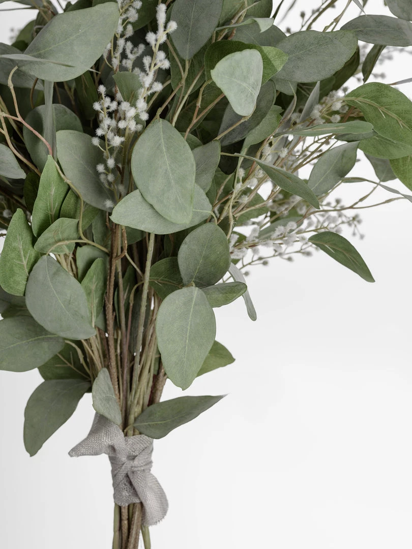 Faux silver dollar eucalyptus stems, round silvery grey/green leaves matched with our best selling willow stem, the perfect year round fuss-free arrangement.