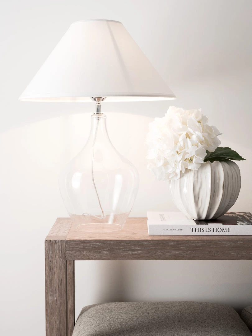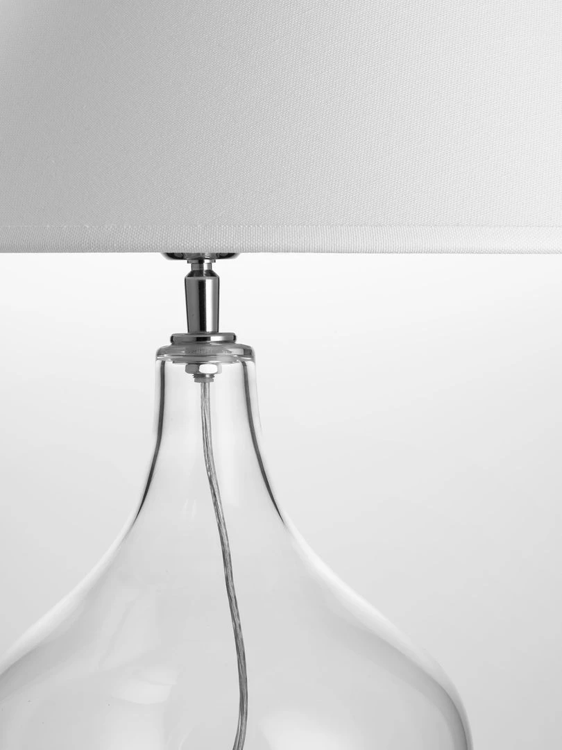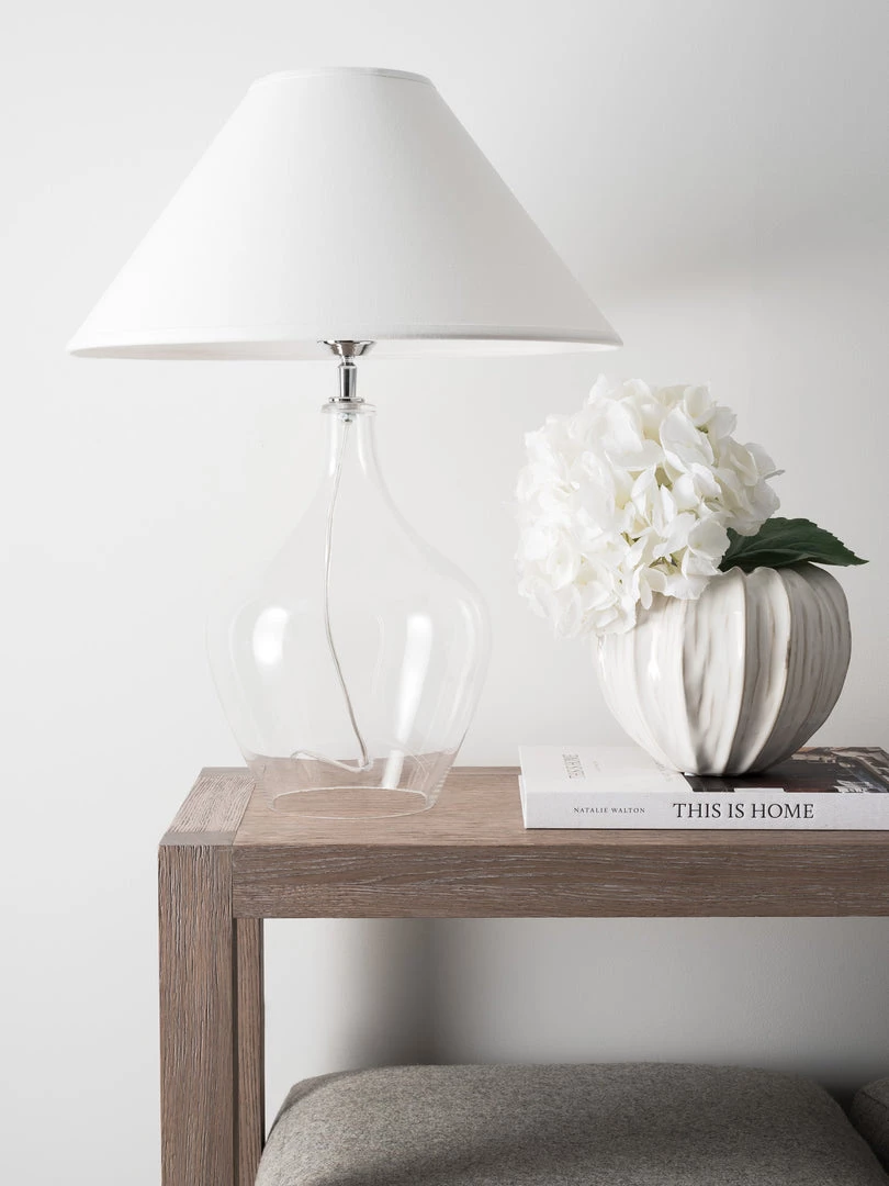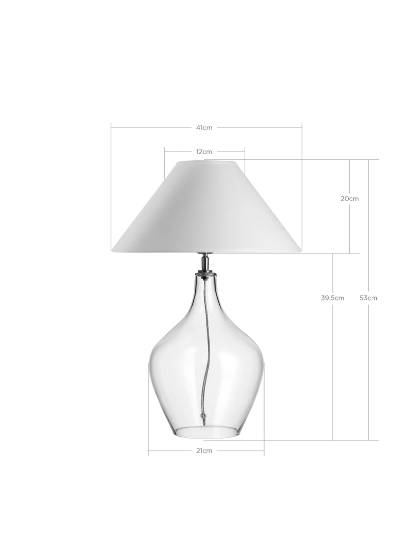 Simple but stylish bottle glass lamp with a white coolie shade, the curved open base produces a beautiful silhouette.