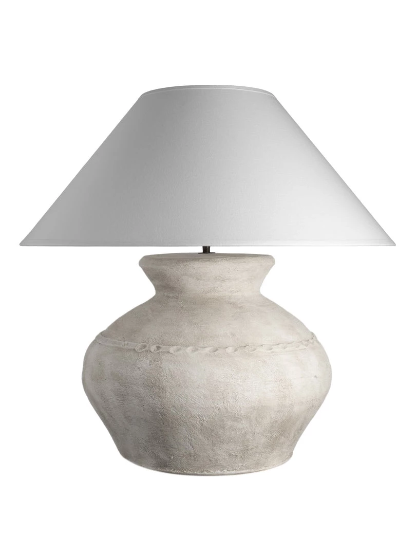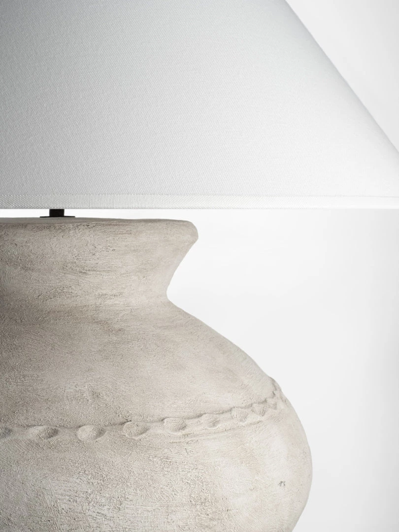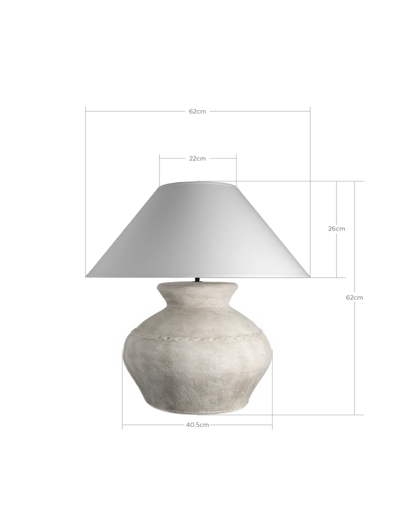 Stunning hand-made off white/beige lamp, made from ceramic with a rustic finish. Each one individually made with a black bulb holder topped with an oversized white coolie shade made in the UK. A beautiful statement lamp.