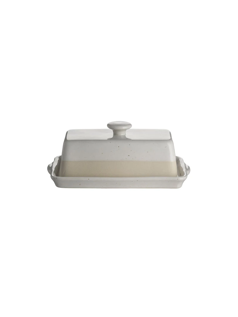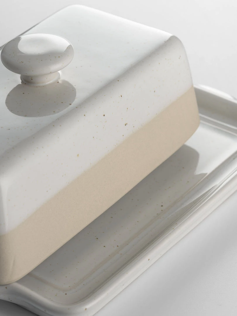 A traditional covered butter dish with handle, holds a whole slab of butter keeping it at room temperature for cooking and spreading.