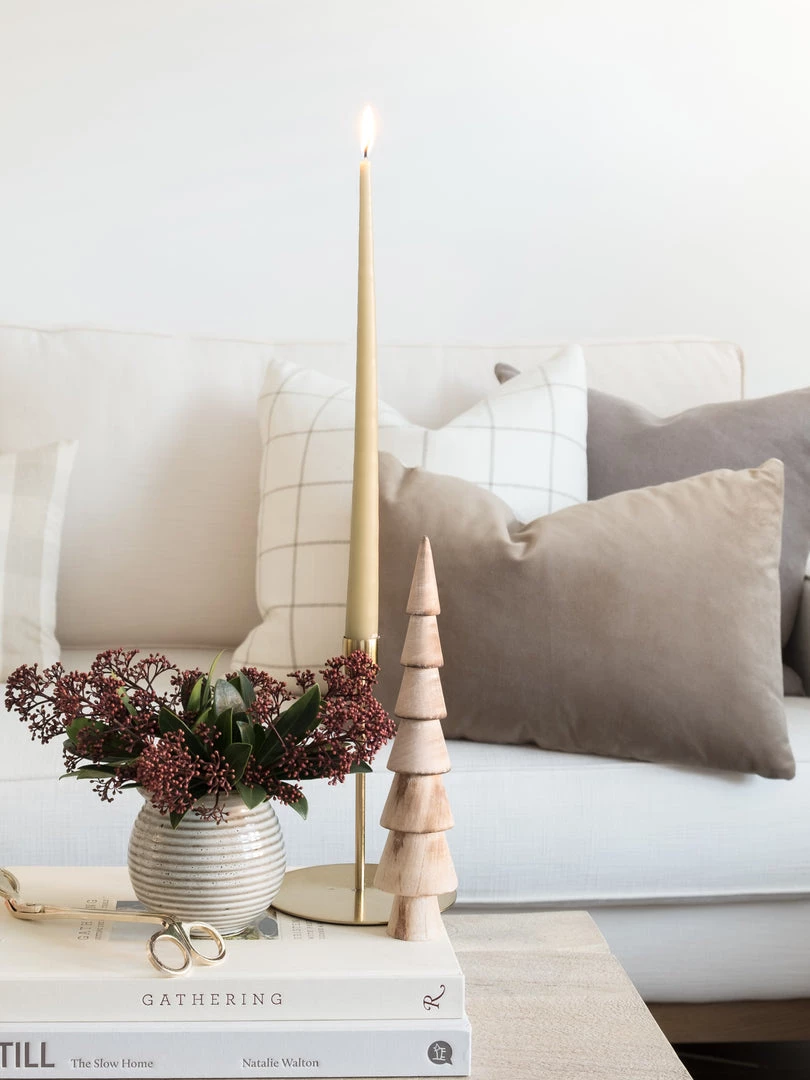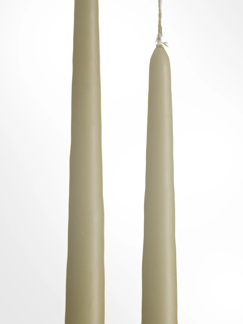 Hand dipped taper candles in a soft olive colour. Slim and elegant these go well in our gold candle holders.