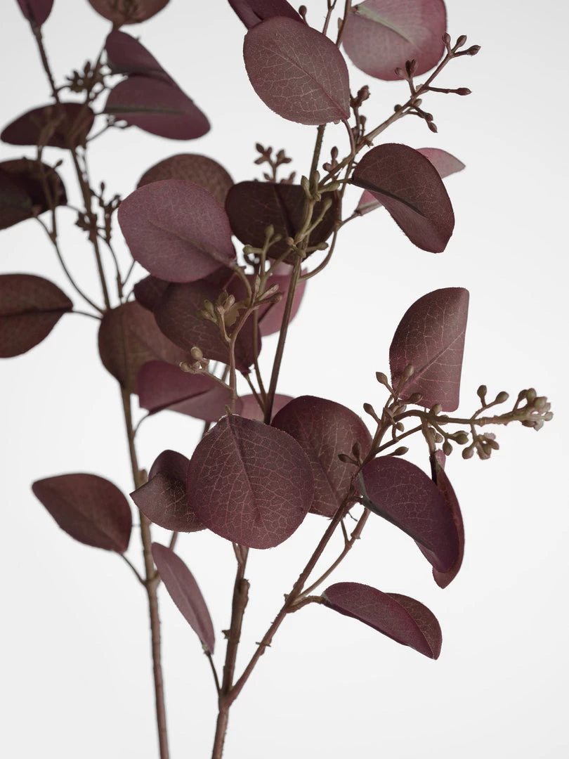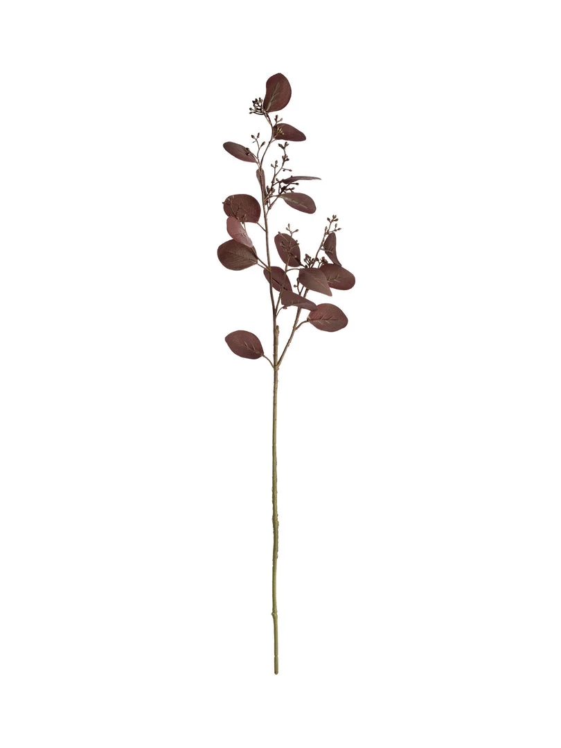 A deep burgundy faux eucalyptus stem for the Autumn/Winter. A large stem with round burgundy leaves and seeds perfect for adding some depth into your faux floral arrangement.