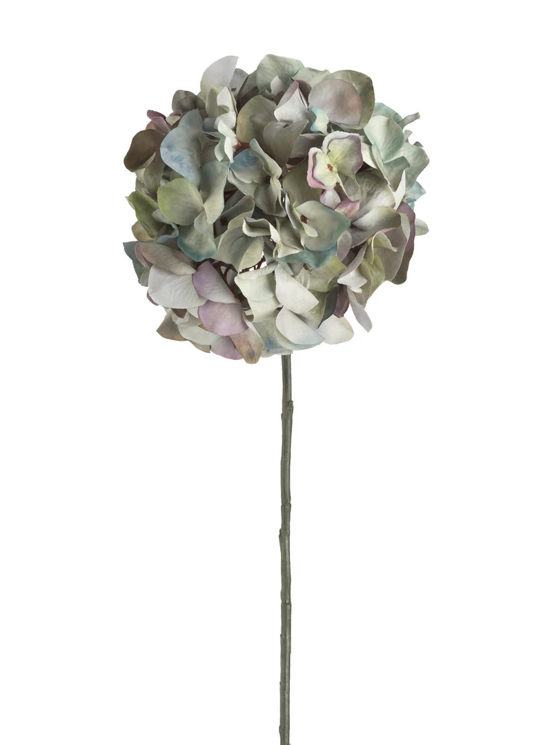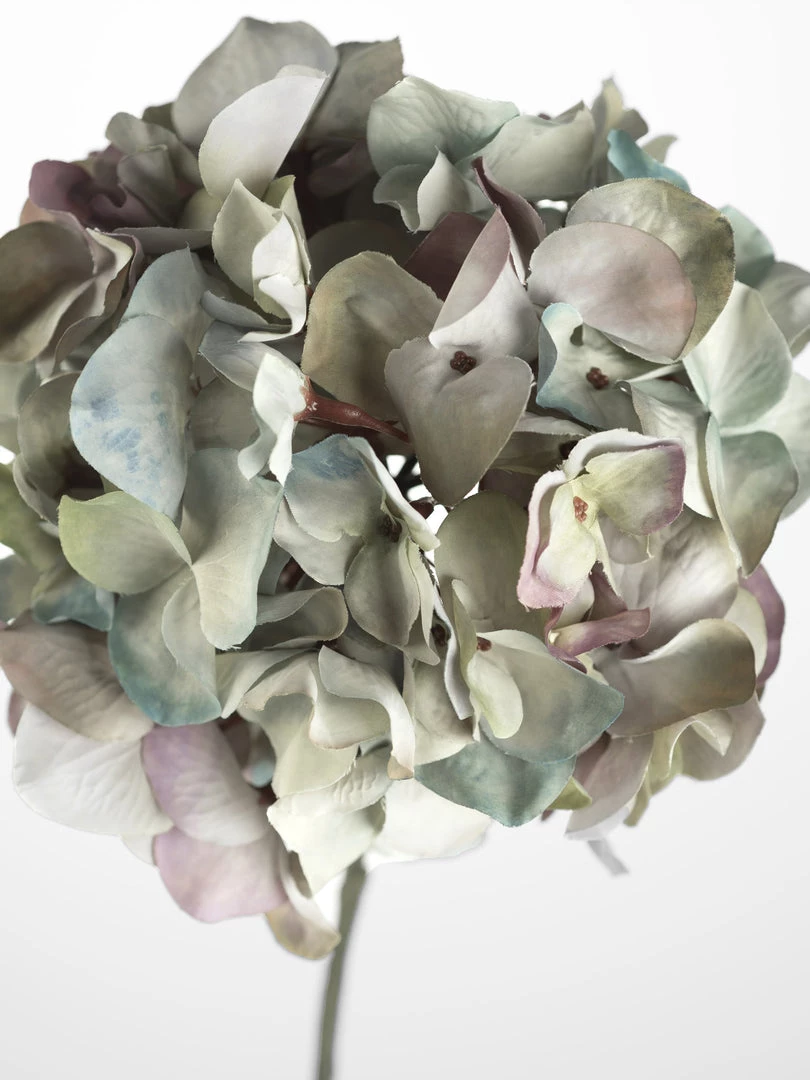 Beautiful faded hydrangea head with tinged petals with subtle hues of soft blues, greens and lavender. Accompanied with Eucalyptus these make an impressive centre piece. (stems can be bent to suit)