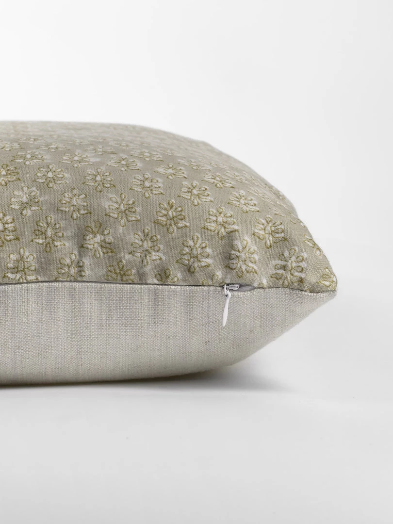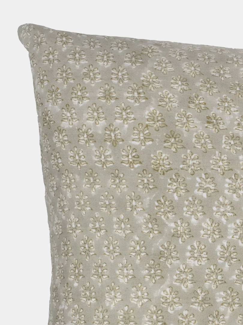 Bahara Olive, a floral block print design with an olive green background, the front of the cushion is made from hand block printed fabric in India with a plain linen back and invisible zipper. Mix in with plains and stripes for a laid back, stylish look. Add comfort to any room with this beautiful floral cushion.