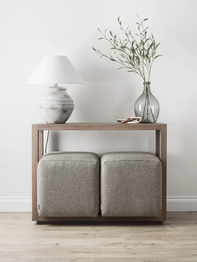 A classic cube ottoman. Practical and stylish, and very versatile – use as a footstool or side table. Made from a solid wood frame it’s strong enough for seating individually or in pairs, tuck-away under a console or style next to your sofa for a useful side table.