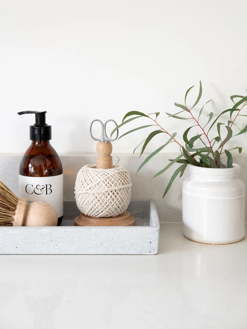 Solid oak turned stand with a ball of natural cotton string and stainless steel scissors, ideal for kitchen or office use. It looks great on any desk or countertop, but it also makes an excellent gift.