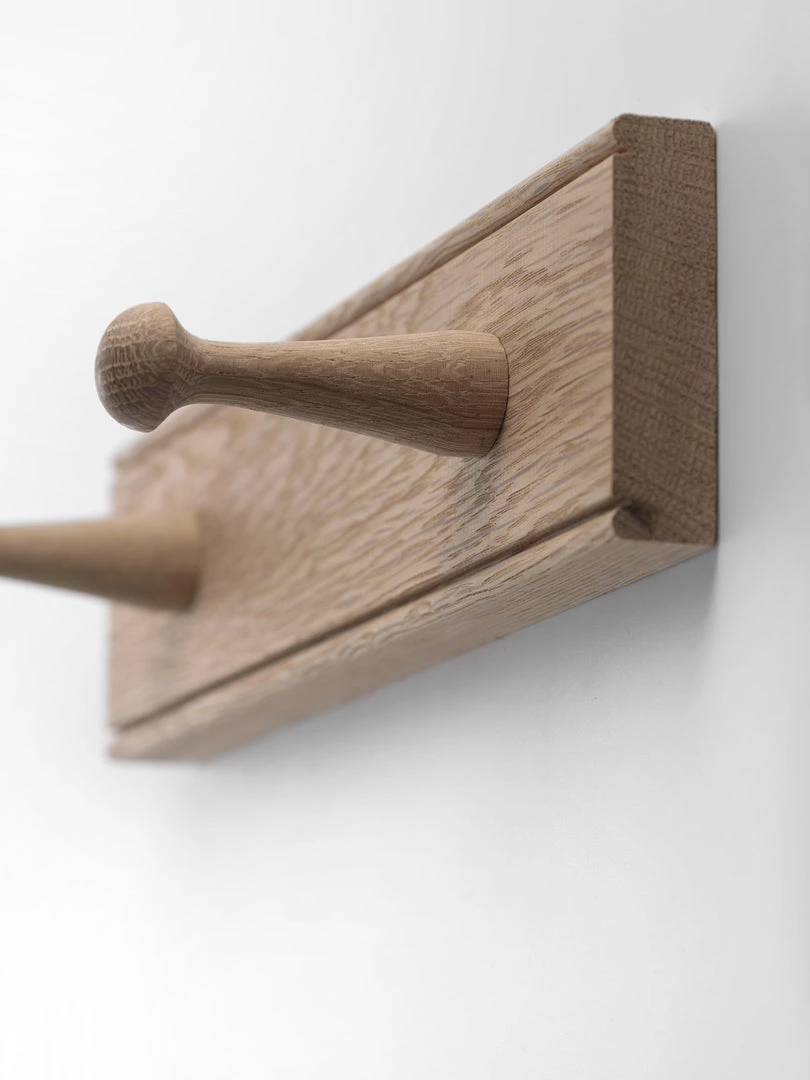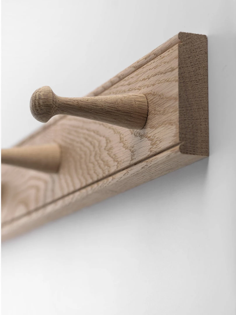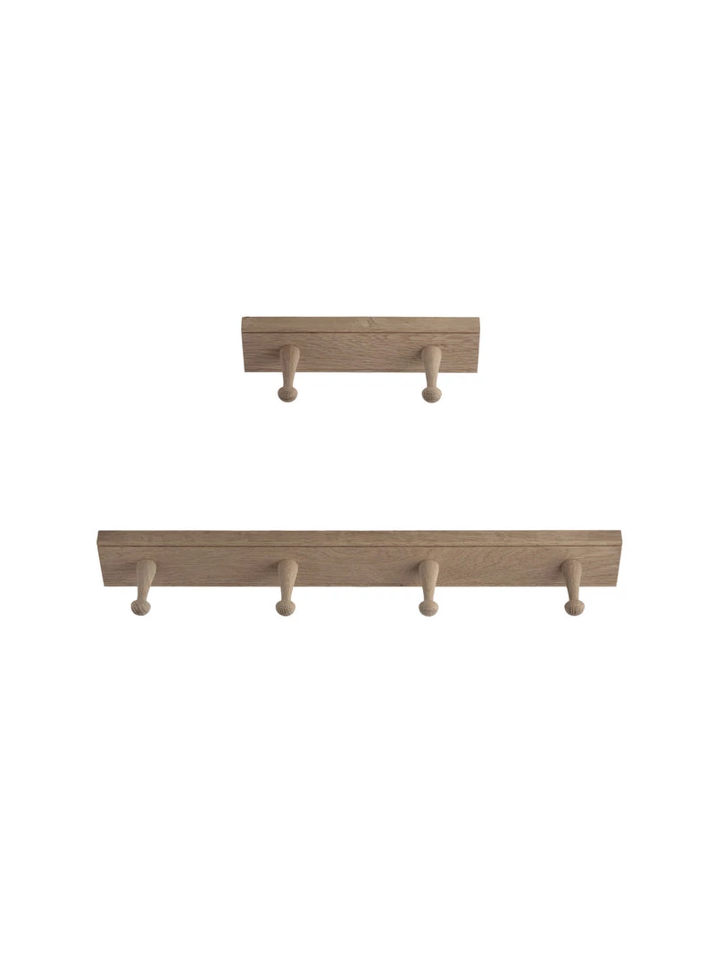 Made here in the UK, a beautifully crafted oak peg rail perfect for coats and jackets, hats and scarves, or storage of any household essentials. 4 or 2 pegs on a solid piece of natural oak with a beaded detail top and bottom and concealed keyhole fixings at the rear.