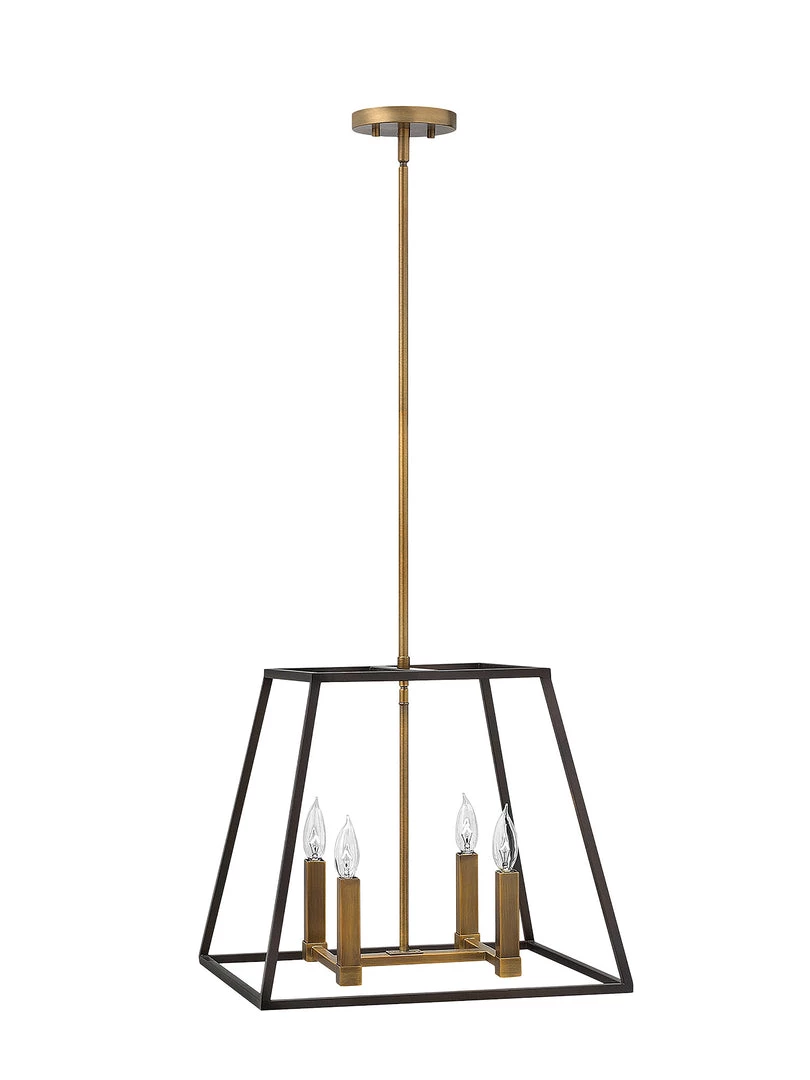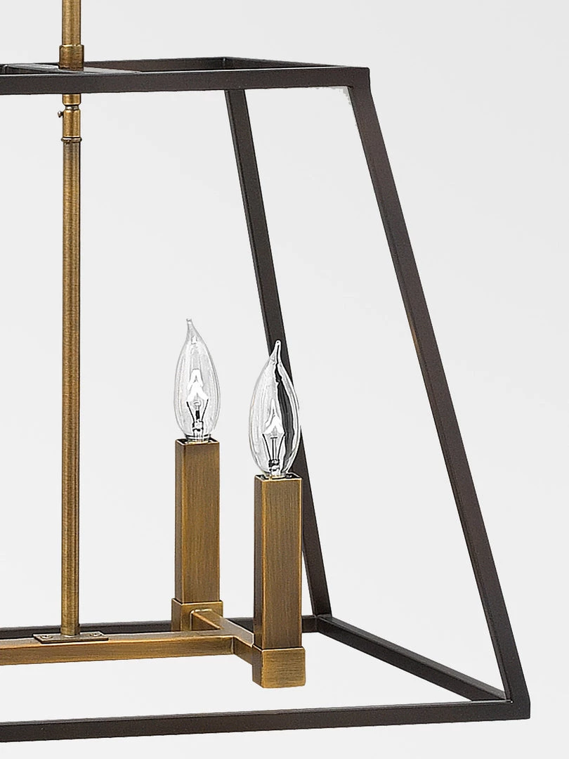 A tapered rectangle metal frames in a warm black bronze finish, gives a vintage industrial aesthetic. Eleangant four square lamp sleeves in a contrasting tone. Without glass.