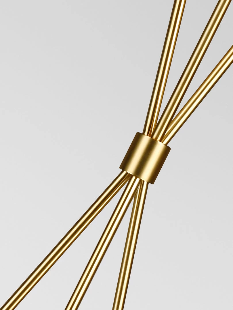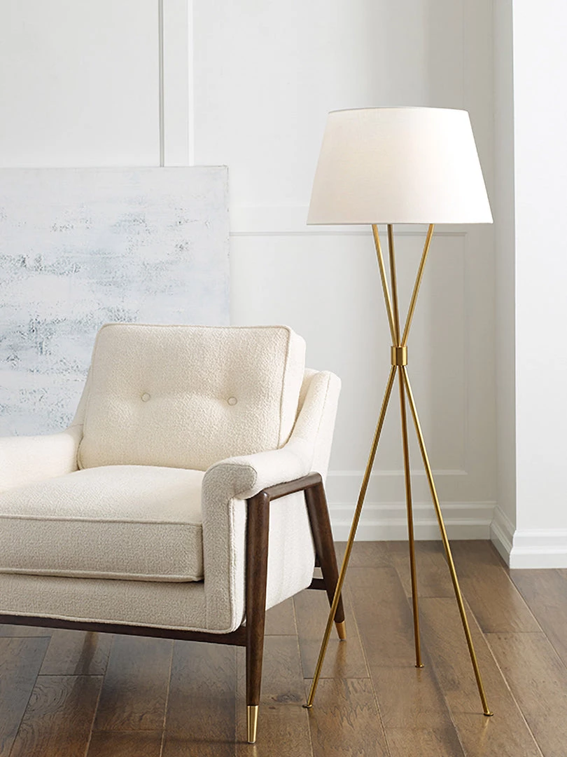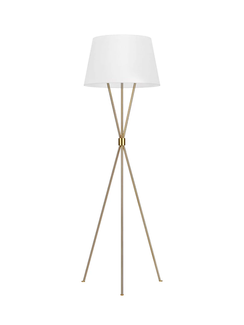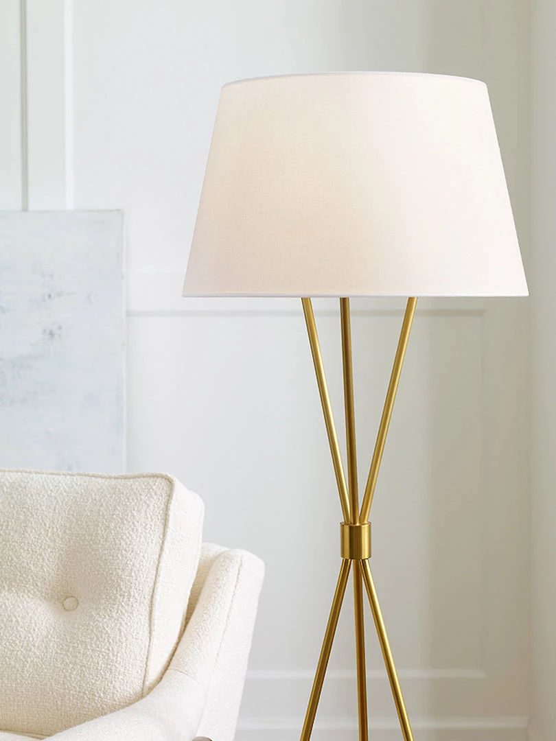 Mid century inspired tripod burnished brass floor lamp, perfect sofa height with elongated legs meeting at a tailored point. Simply stunning.