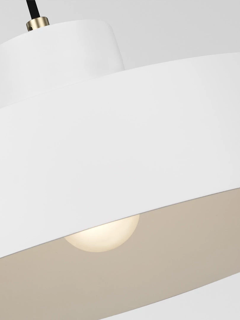 Modern vintage style rise and fall pendant for adjustable downlight. Metal spun shade in matt white finish and burnished brass hardware and counterweight.Â