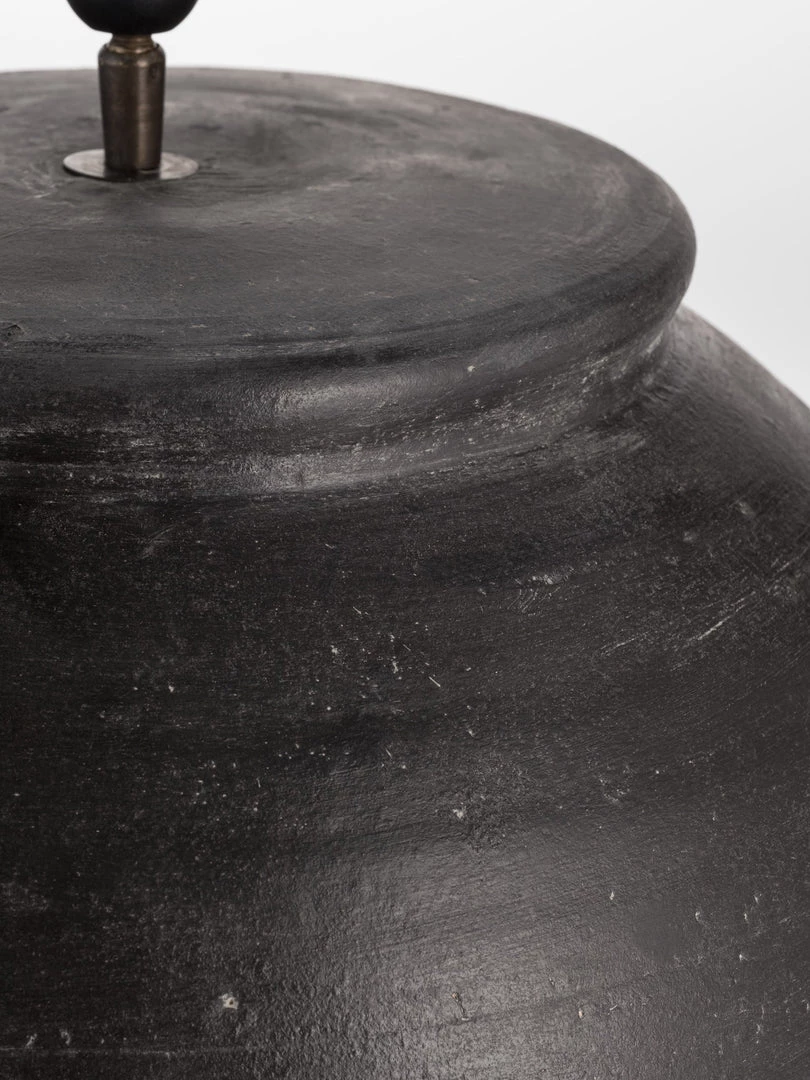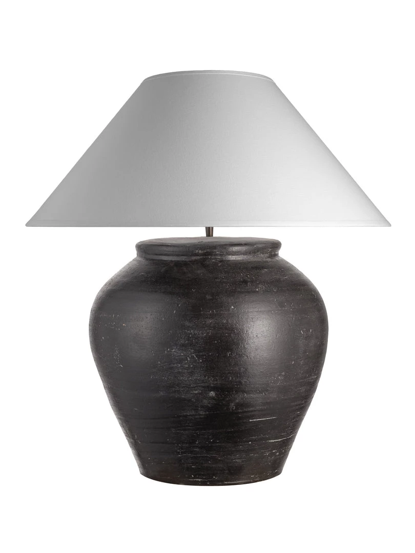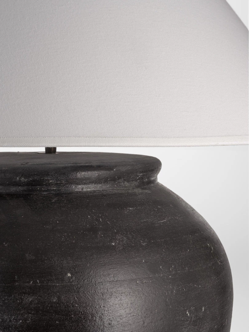 Oversized large distressed black finish lamp base with off white coolie shade. Each one individually made with a black bulb holder topped with an oversized white coolie shade made in the UK.