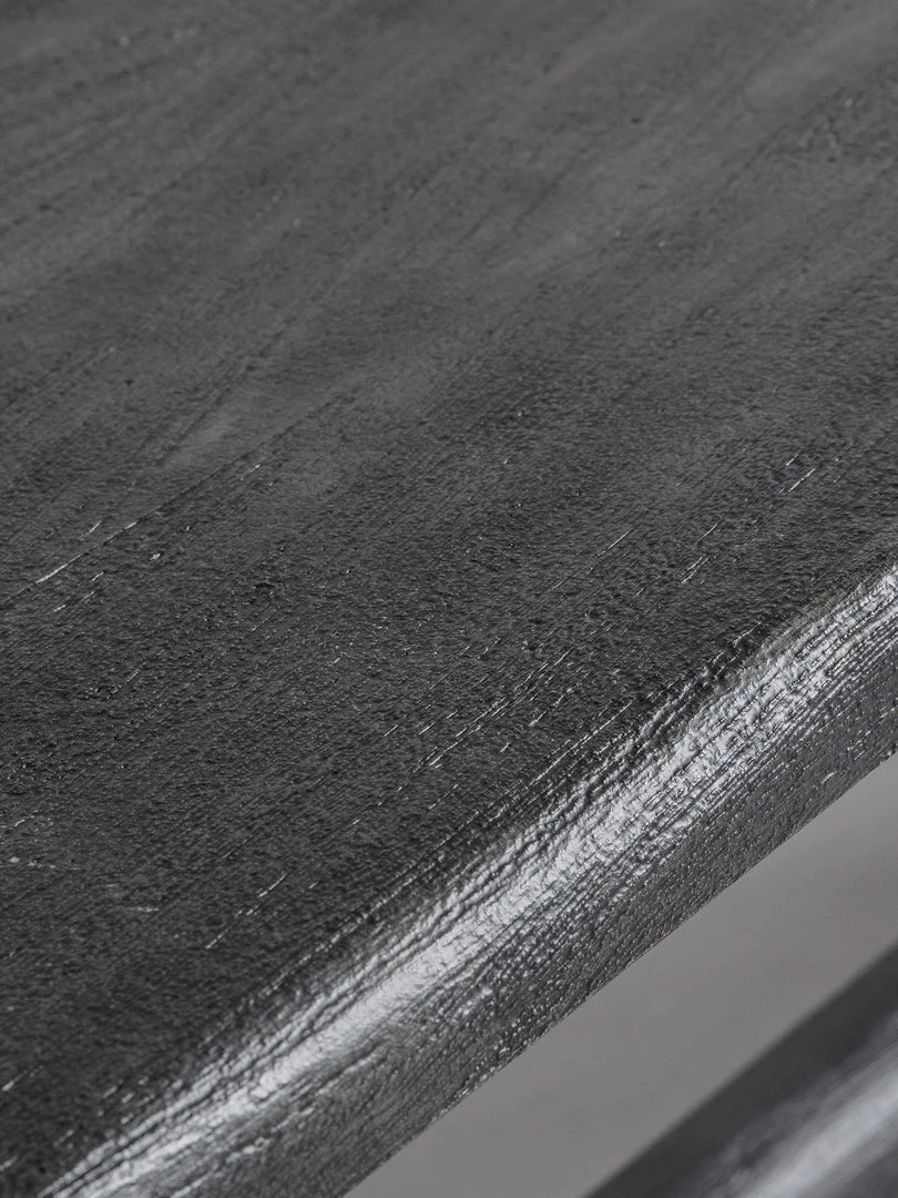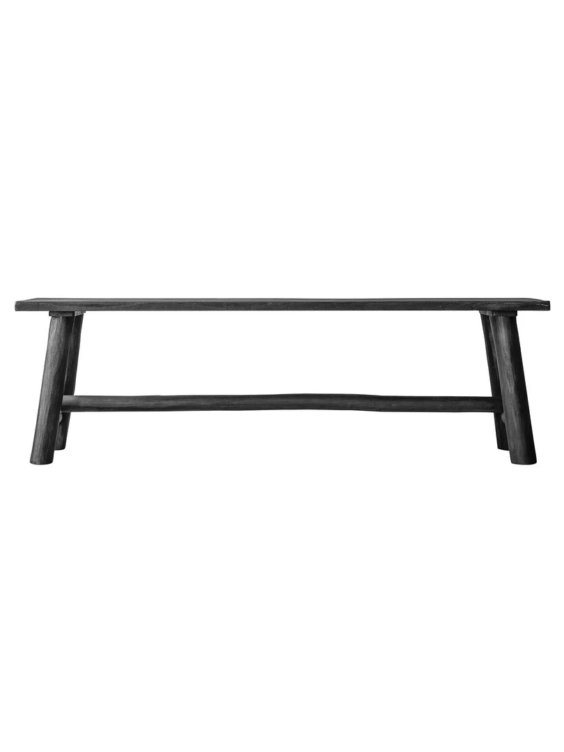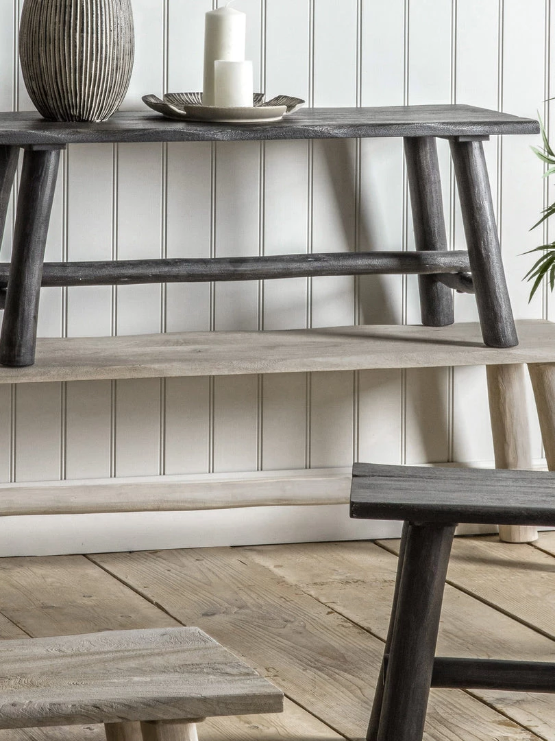 The Abrama Bench large is made from solid acacia wood in a charcoal finish, with rustic turned legs and a natural edge on the top for a country feel.