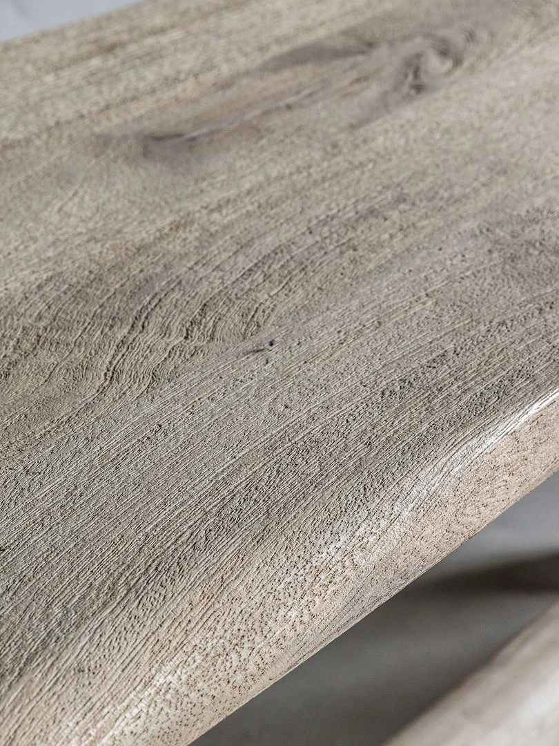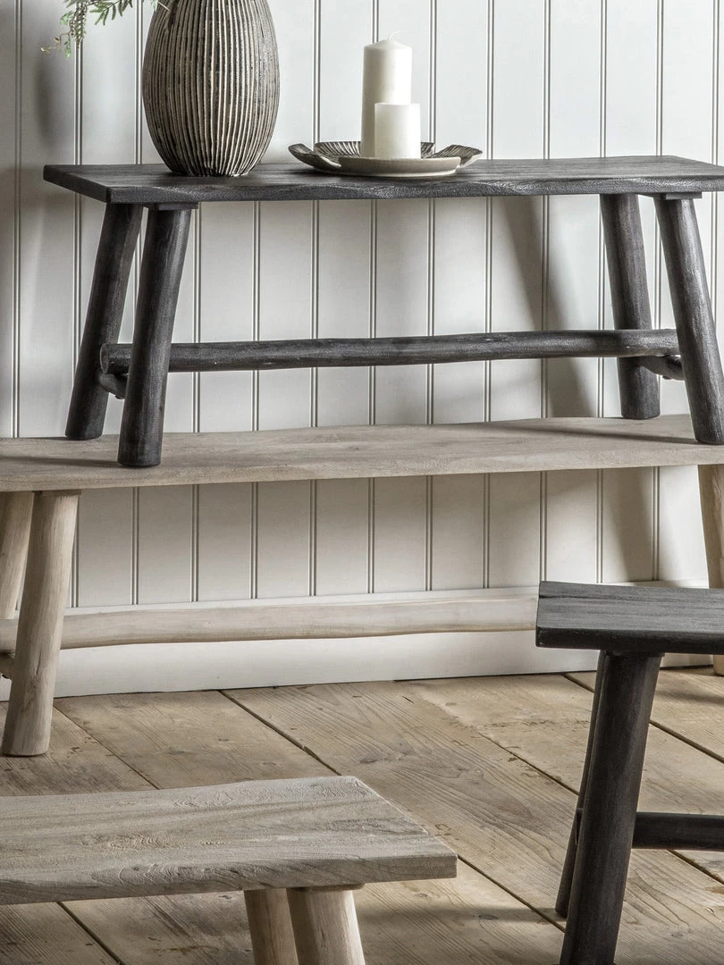 The Abrama Bench large is made from solid acacia wood in a soft natural finish, with rustic turned legs and a natural edge on the top for a country feel.