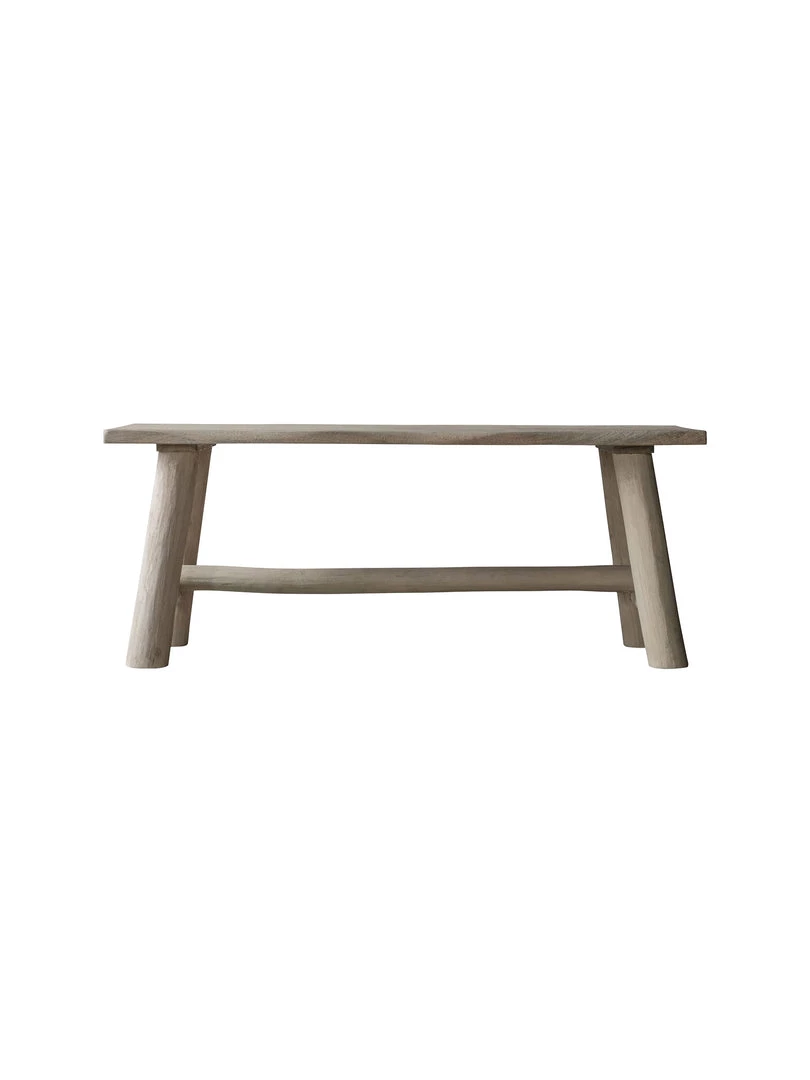 The Abrama Bench is made from solid acacia wood in a soft natural finish, with rustic turned legs and a natural edge on the top for a country feel.