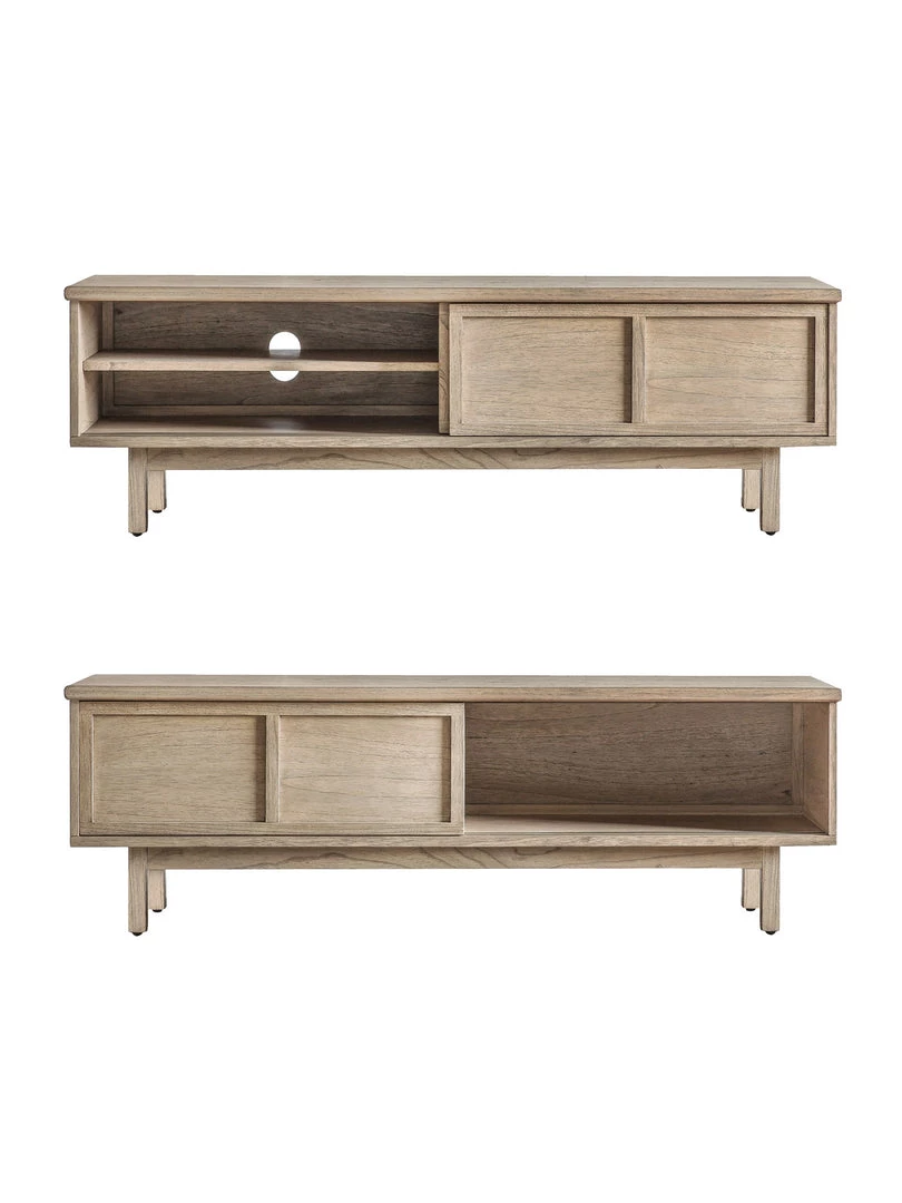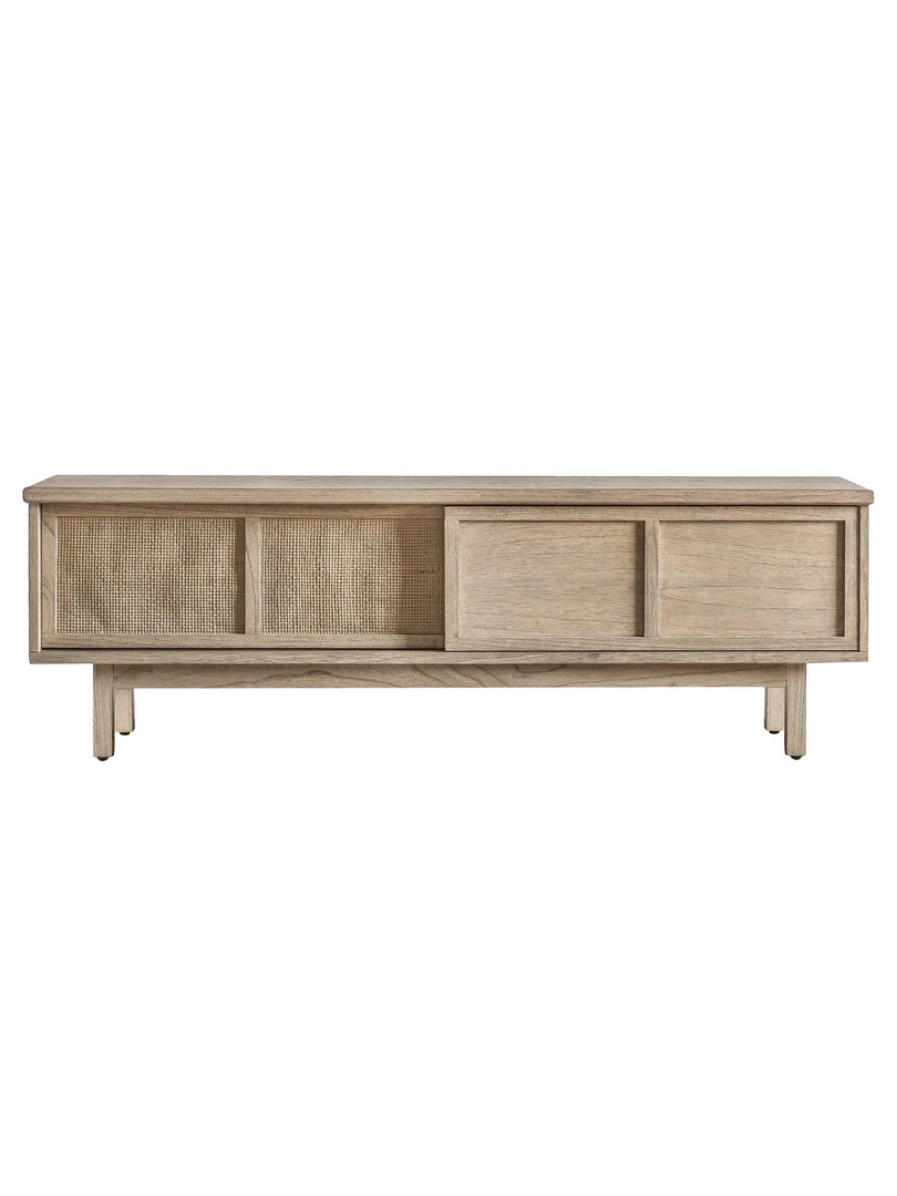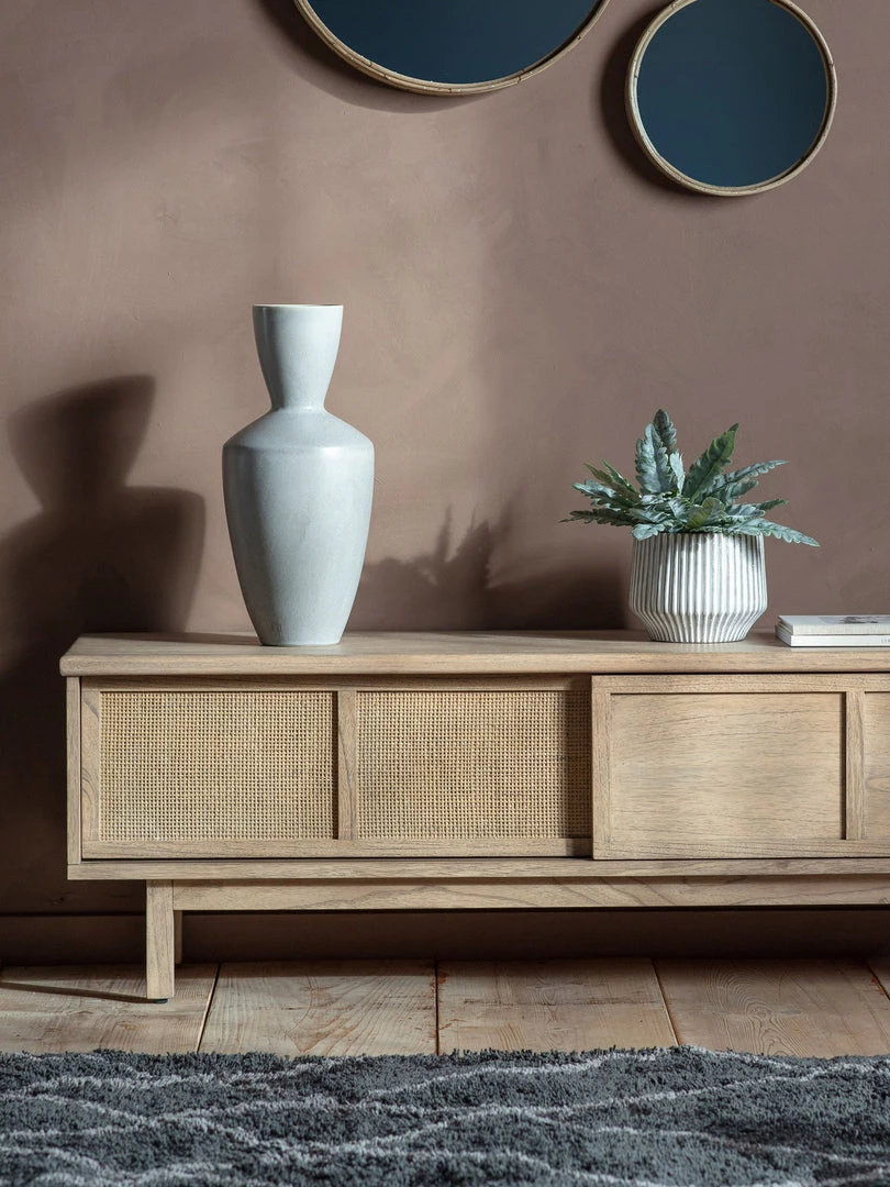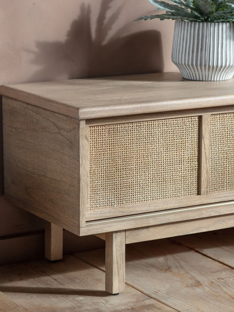 This stylish media unit, which is crafted from Mindy ash solids and veneers, combined with hand-woven cane inserts, features sliding doors. Kyoto is the perfect range to add a touch of unique style to any interior, featuring a traditional lightly weathered finish with modern slatted detailing, hand-woven cane and brushed bronze handles. Also including a sideboard, cupboard, coffee and console table, plus a practical supper table and unique slatted side table, this collection adds a touch of simplistic minimalisation to any interior space.