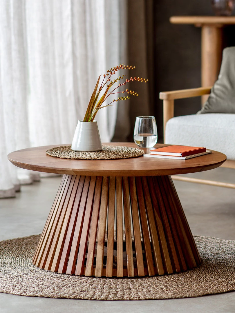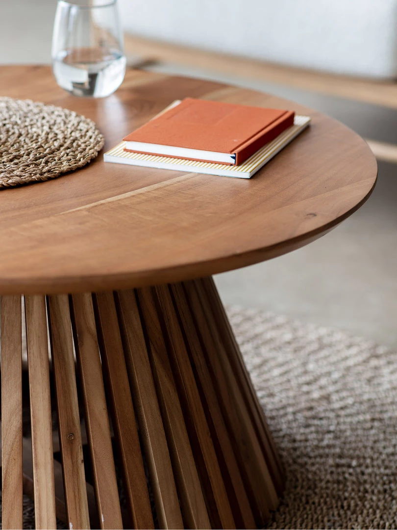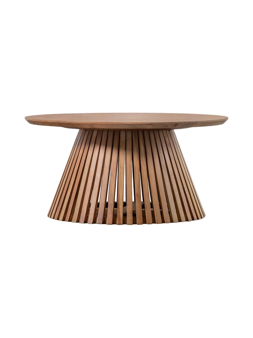 Add a stylish contemporary look to a room with this stunning coffee table. The base features gently sloping wood slats which create a stunning design feature. The table is crafted from solid acacia wood in a natural finish to show the grain of the timber. A matching side table and dining table are also available.