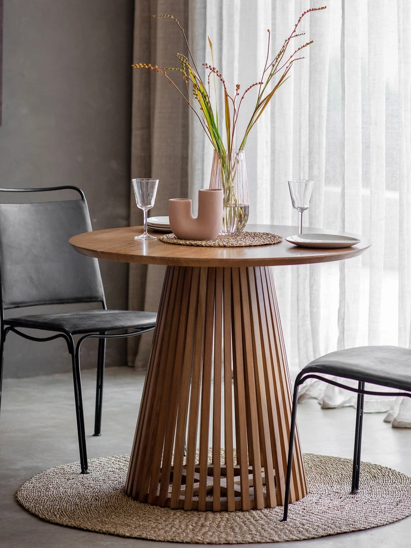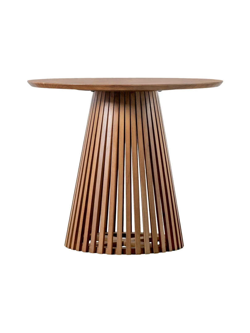 Add a stylish contemporary look to a room with this stunning dining room table. The base features gently sloping wood slats which create a stunning design feature. The table is crafted from solid acacia wood in a natural finish to show the grain of the timber. A matching side table and coffee table are also available.