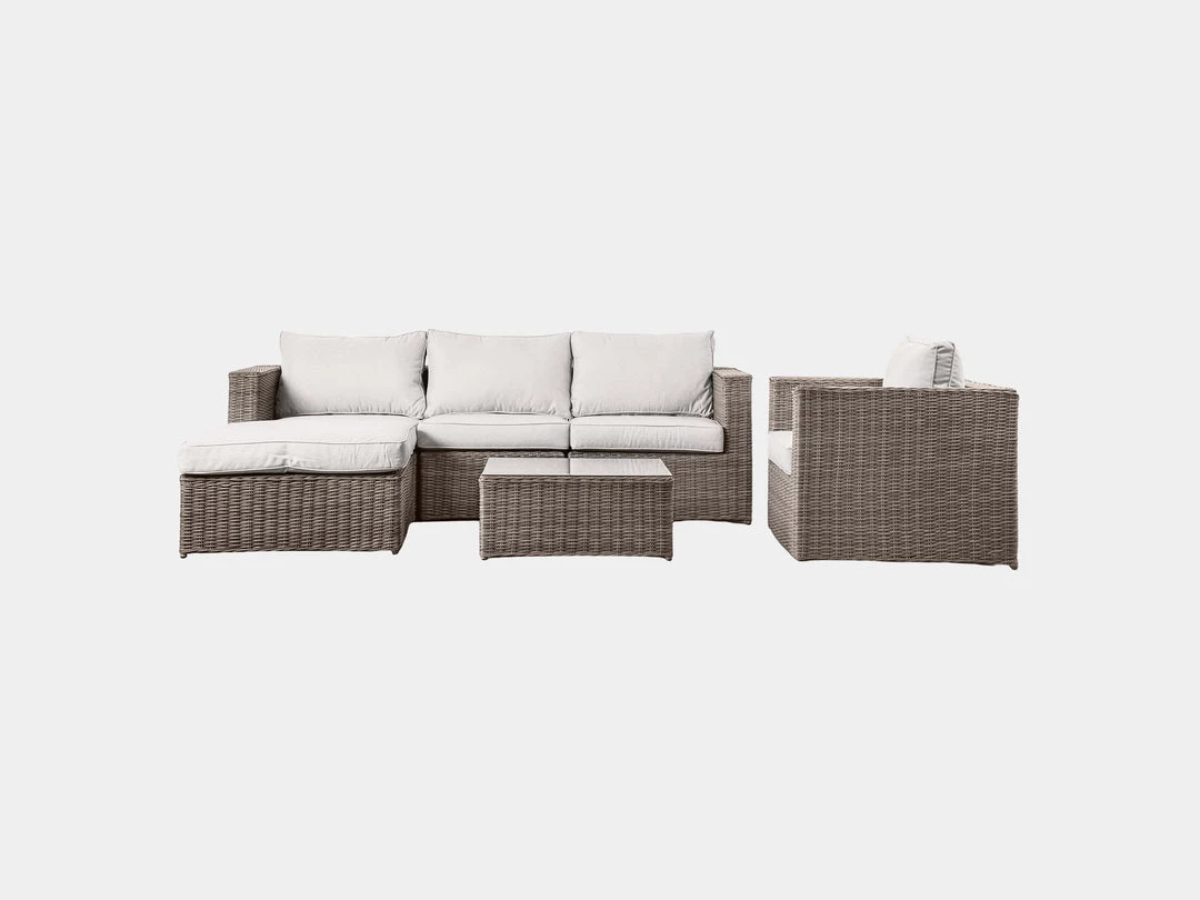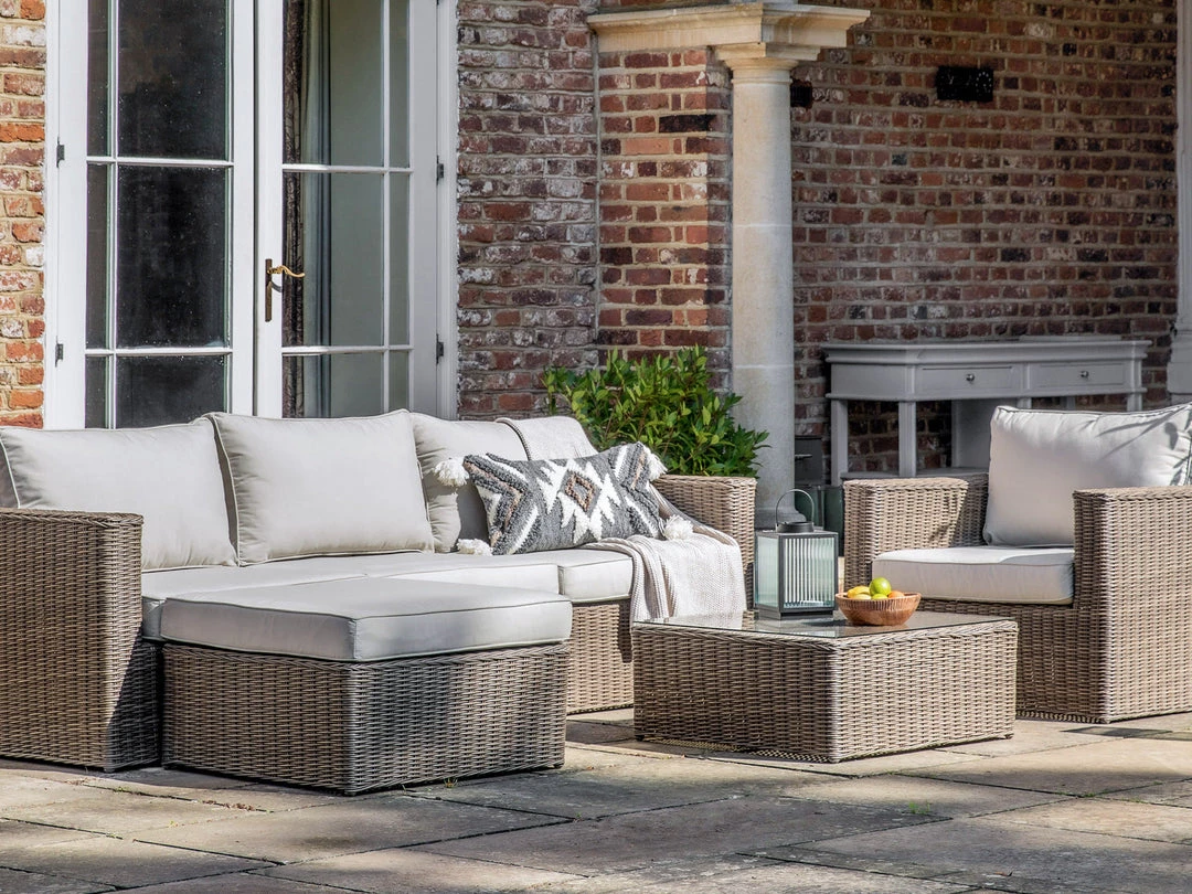This Chaise Sofa and Chair Set features a modular sofa, comprising two corner units, a middle unit and an ottoman to create the chaise part of the sofa, along with an armchair and coffee table. The ottoman can be positioned at either end of the sofa. All are crafted from all weather 5mm PE rattan with a hand woven mixed half round/full round weave in a natural finish.