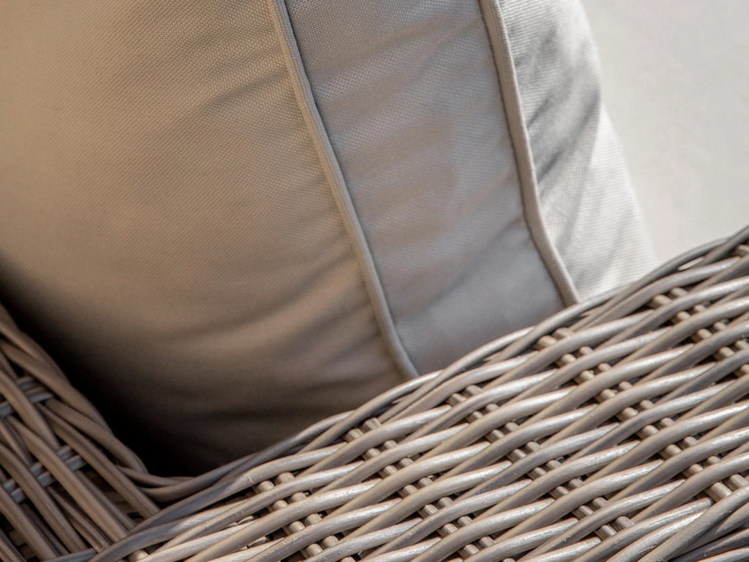For comfort, the sofa and armchair have luxurious showerproof cushions in a soft neutral colour to complement the colour of the rattan. The frames are powder coated aluminium and the table top is tempered glass. The chaise sofa and chair set is also available in a washed grey finish. The collection offers a great range of pieces, so you can select the ones to suit your requirements.