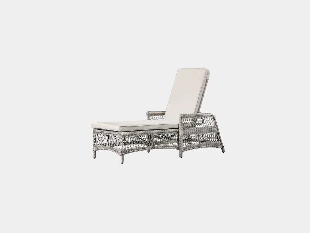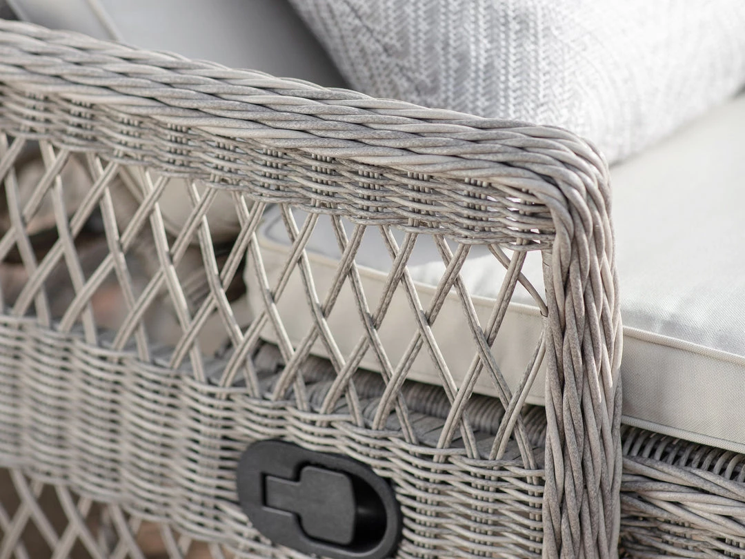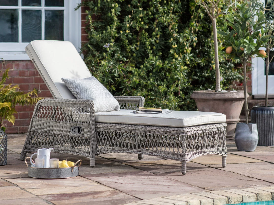 This beautiful Lounger is crafted from hand woven all weather 5mm PE rattan with a combination of close weave and open weave patterns to give a stylish design in a lovely stone colour. For comfort, the back of the lounger reclines and it has a luxurious showerproof seat and back cushion in a soft colour to complement the colour of the rattan. The frame is powder coated aluminium. A matching dining set and sofa Dining/Tea Set are also available.