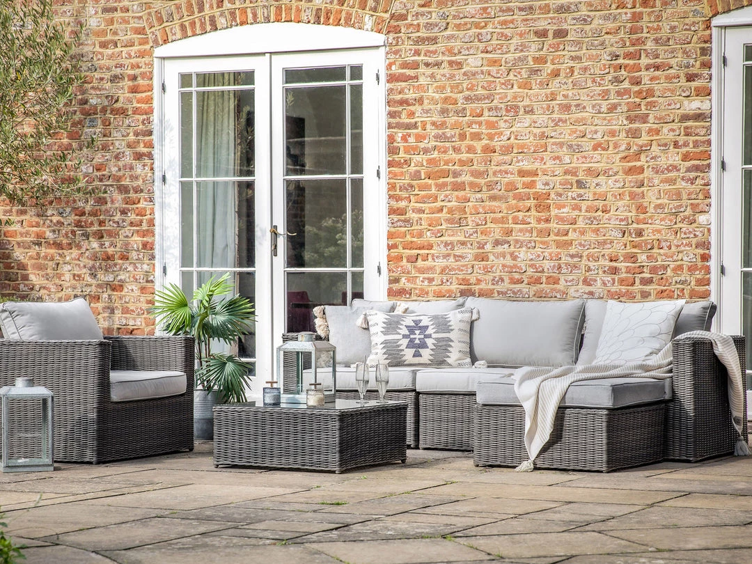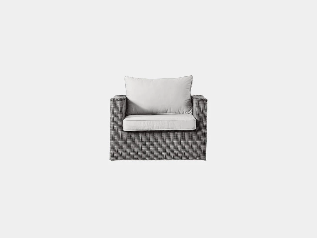 This armchair is crafted from all weather 5mm PE rattan with a hand woven mixed half round/full round weave in a washed grey finish to give a lovely subtle tone. It has a luxurious showerproof seat and back cushion for comfort, in a soft grey to complement the colour of the rattan.