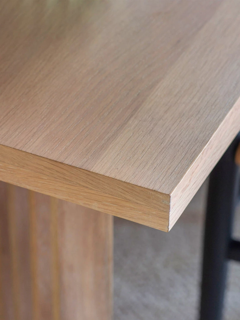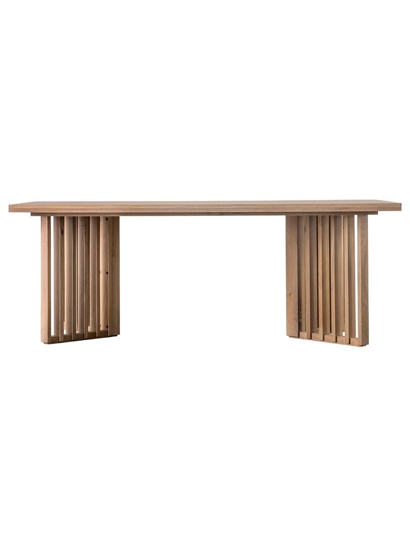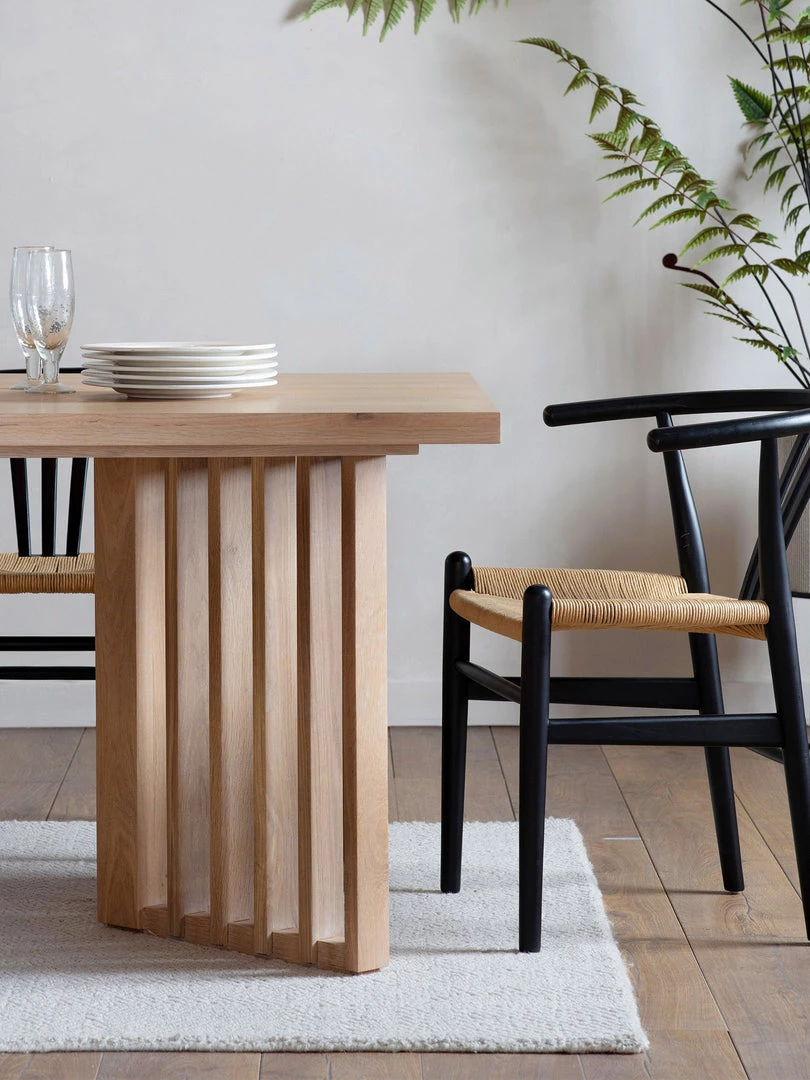The Okayama Dining Table features solid oak slatted legs in a double chevron layout, to create an eye-catching and unusual design feature.