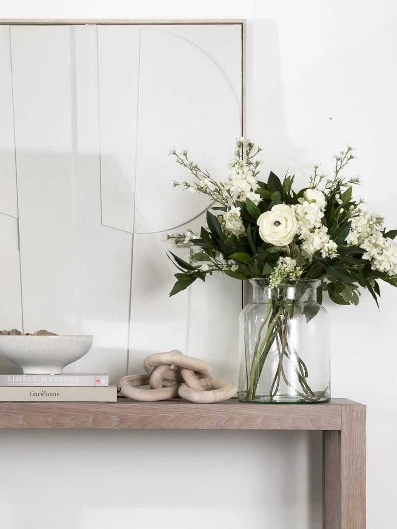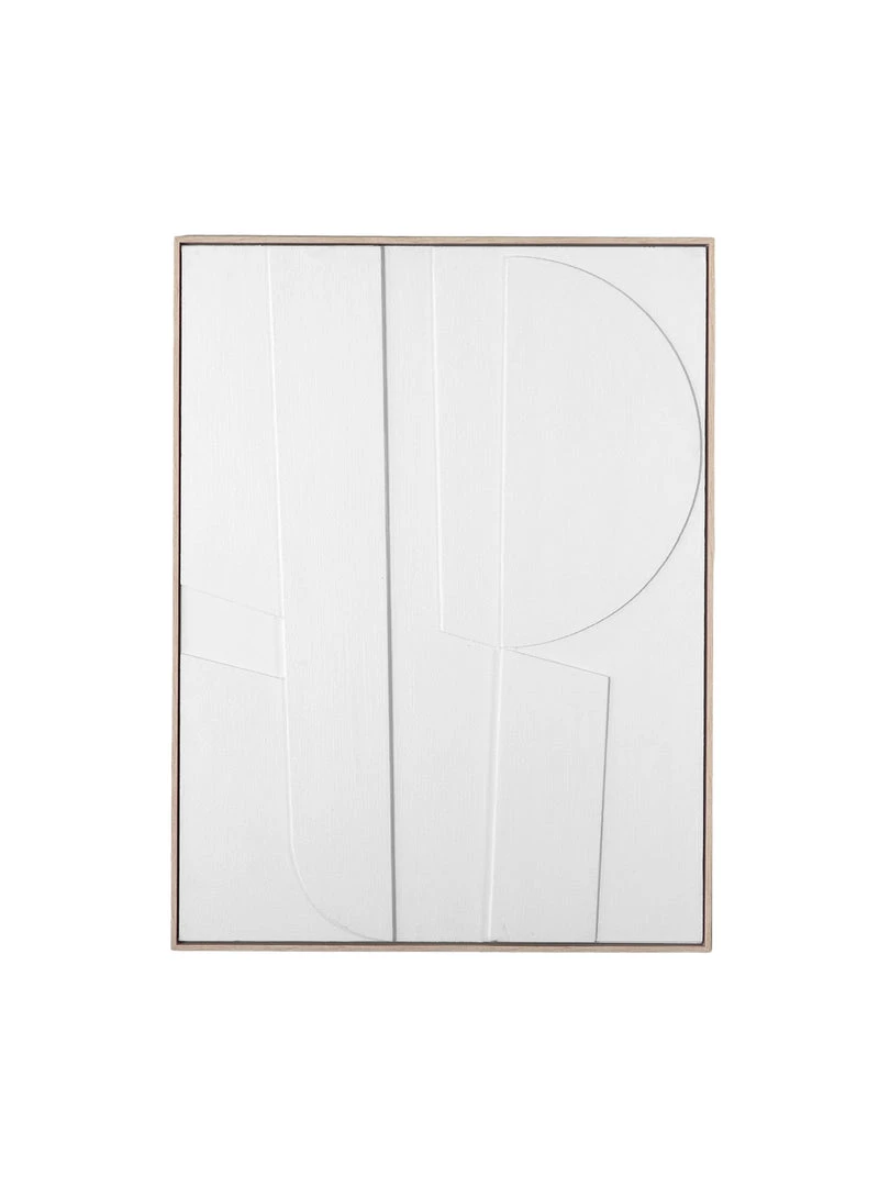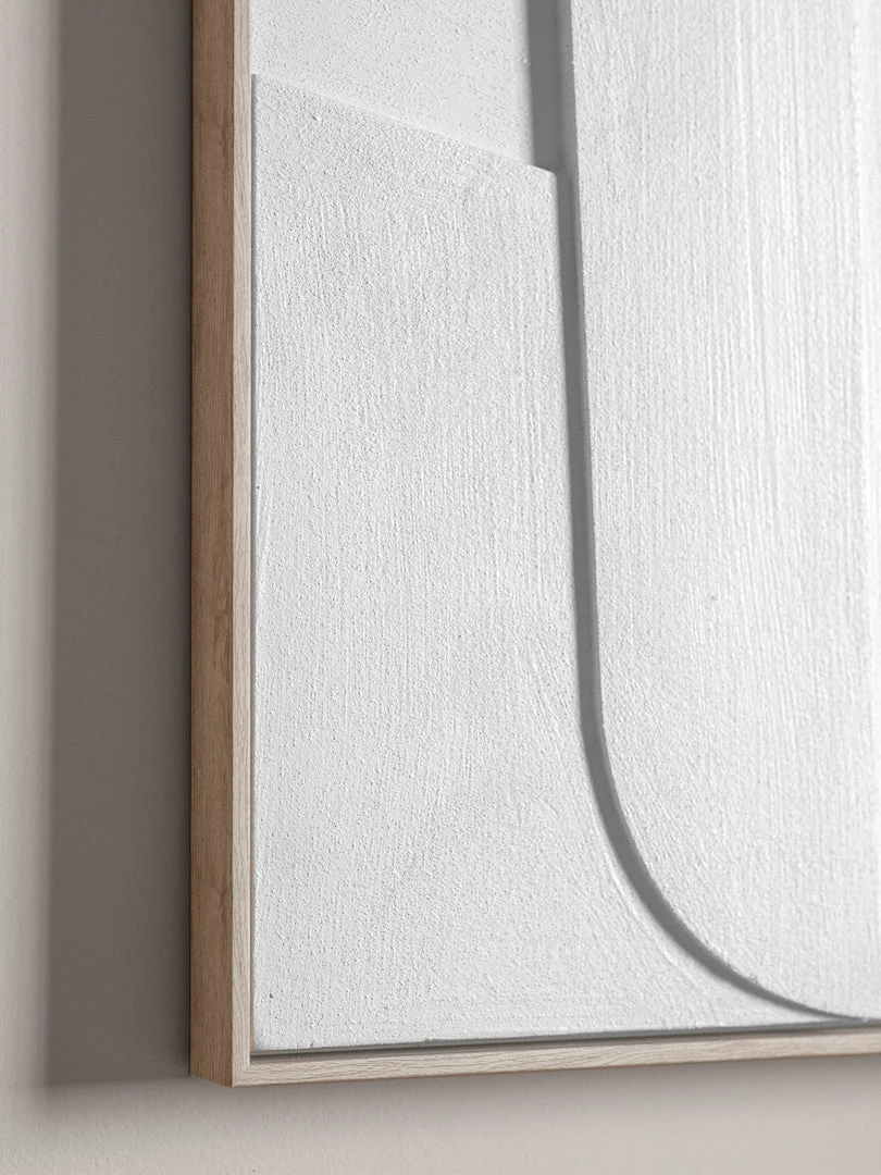 A contemporary natural wood effect frame surrounds a 3D relief artwork of geometric shapes, in soft off-white tones with a natural texture.