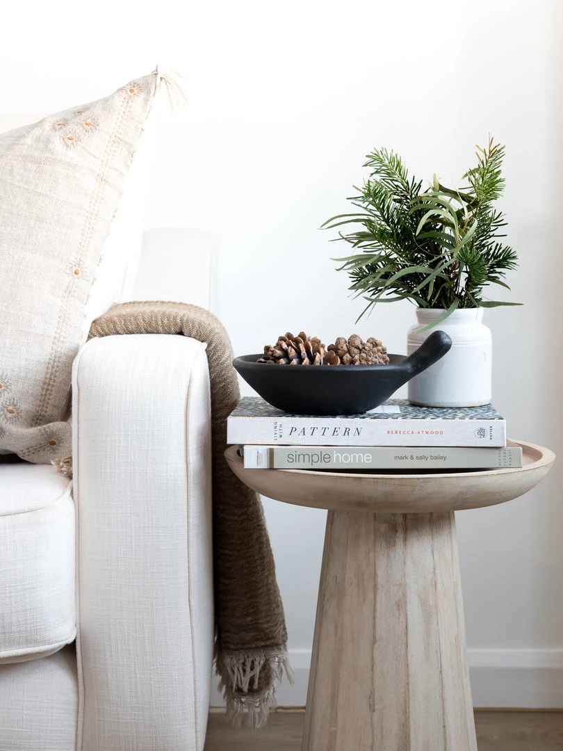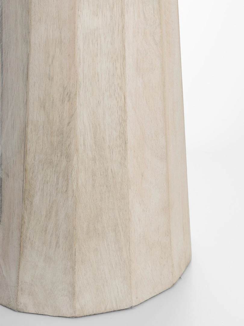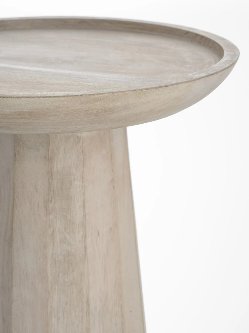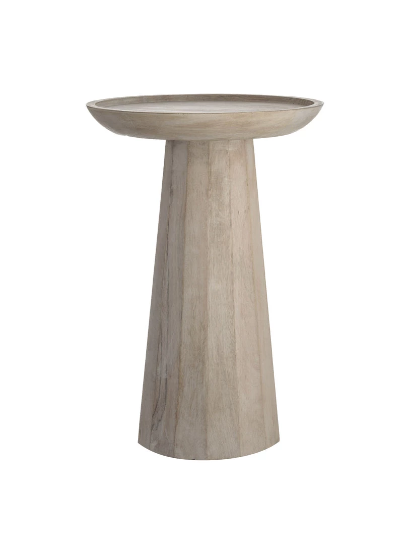 Beautiful white wash side table made from mango wood. With its unusual conical ridged shape and small dish like top, this little table is useful but very stylish. Perfect edge of sofa table or occasional table.