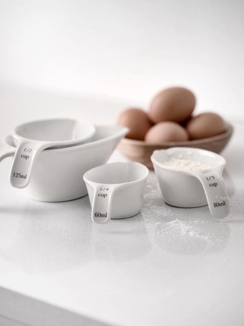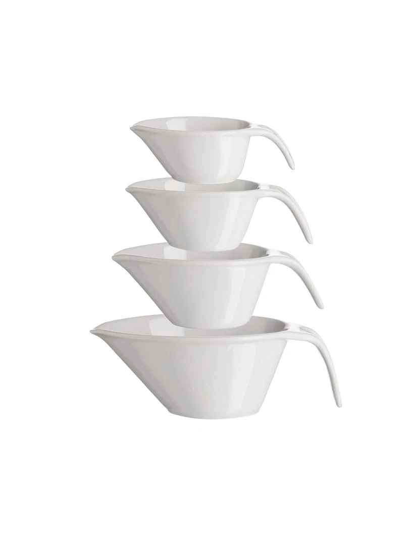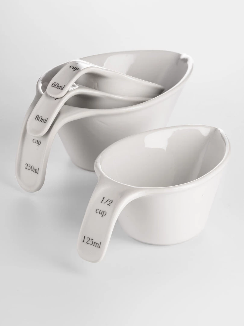 Ensure favourite bakes and culinary creations have precise ingredients with this Measuring Cup Set. The set of 4 measures 60, 80, 125 and 250ml or 1/4, 1/3, 1/2 and 1 cups and nest together to store in a drawer or cupboard. The distinctive teardrop shapes are crafted in neutral white Porcelain, ready to become staple items in kitchens for years to come.