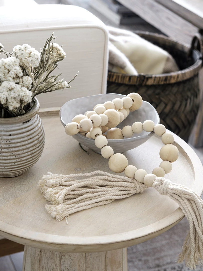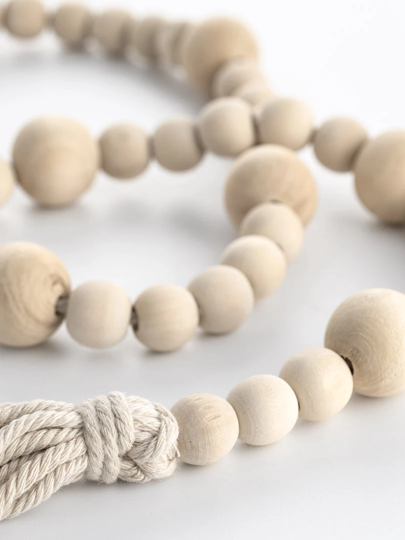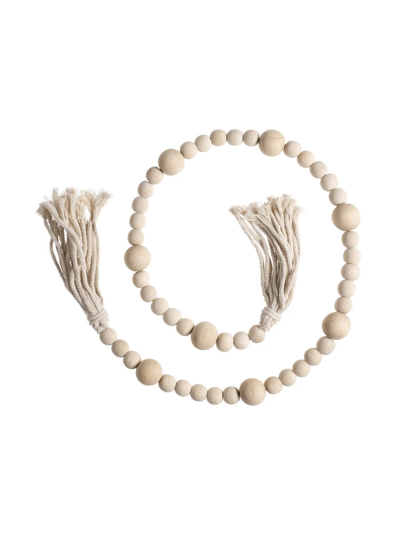 Add interest to your decor with this wooden beaded garland. The cream beads are each fitted with jute tassels at either end so you can drape them over books and vases, or coil them on a bookshelf for a more contemporary look.