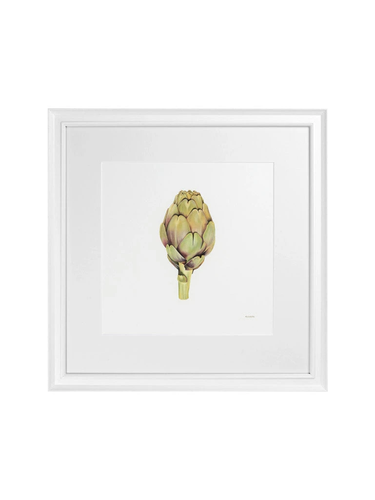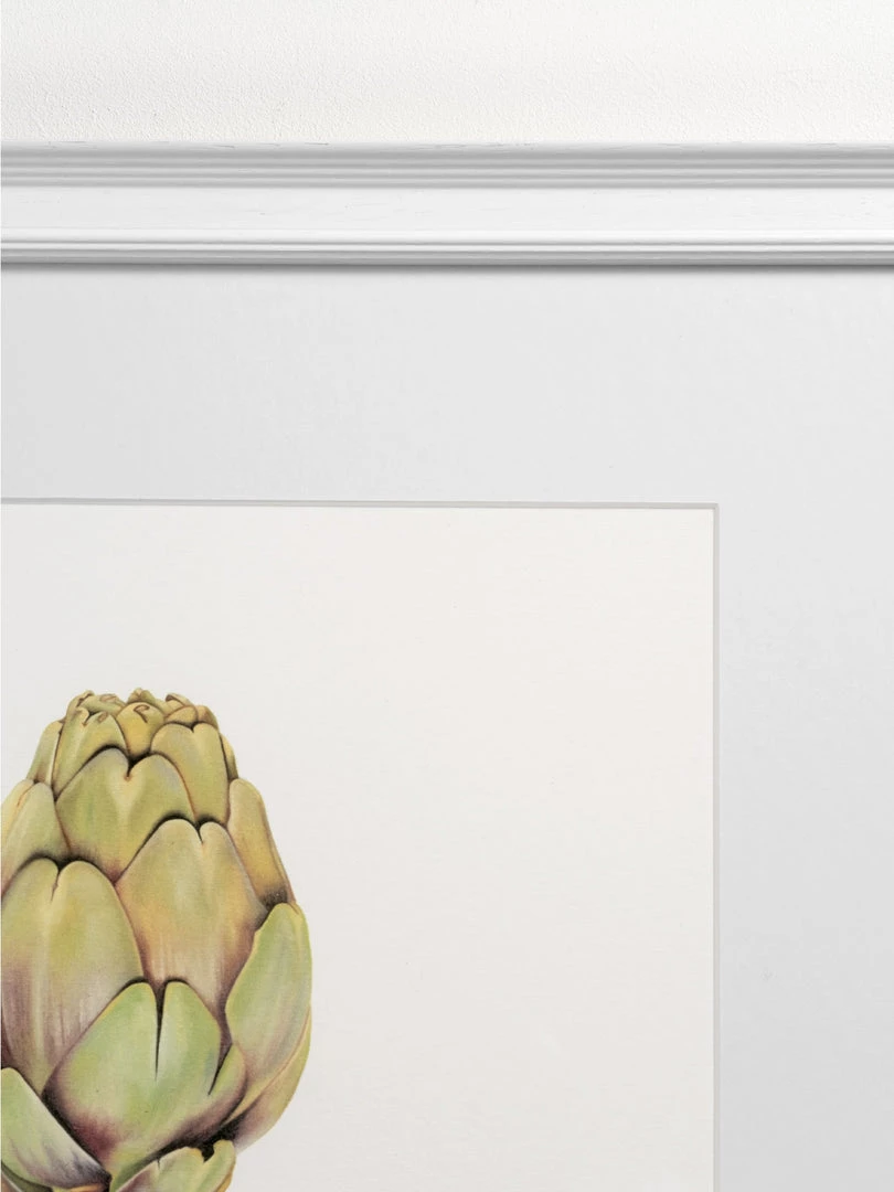 Still life print of an artichoke painted by artist M Gibson, mounted in a soft white mount framed with a white wooden frame.