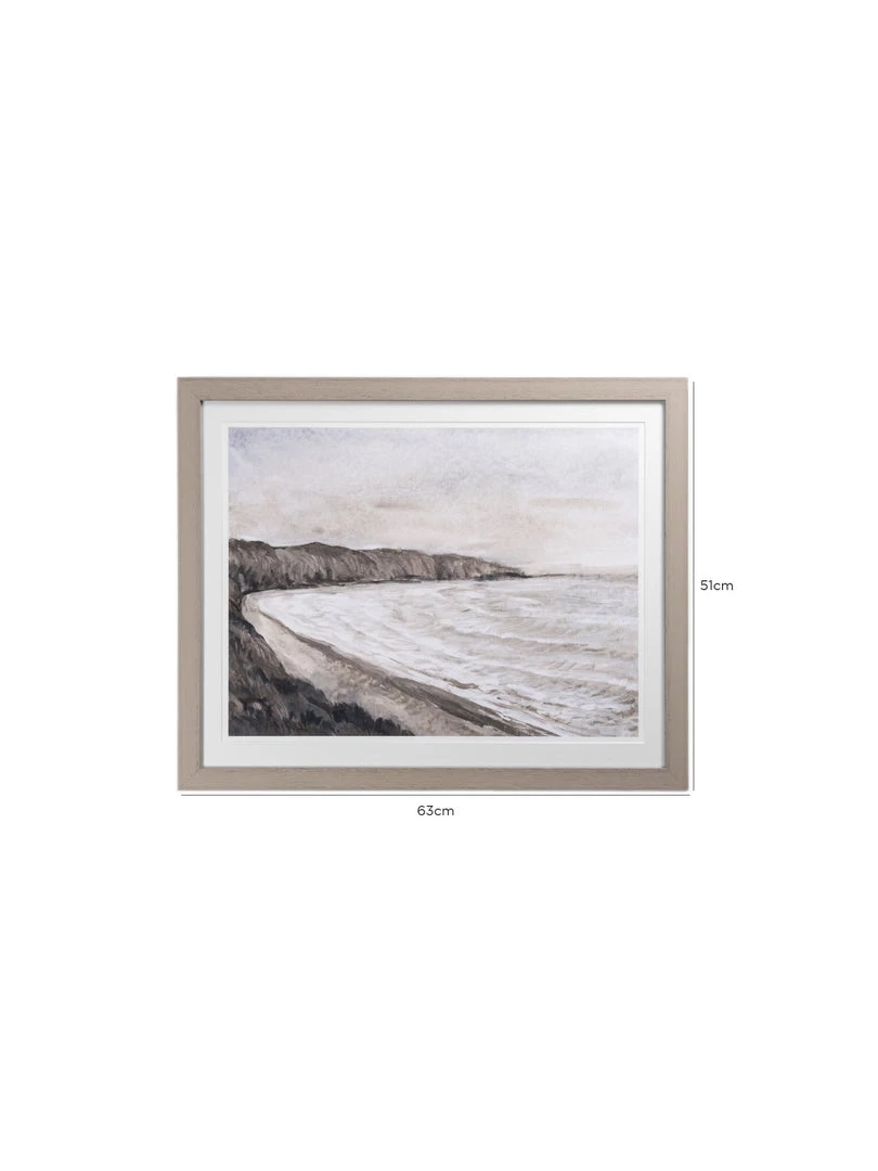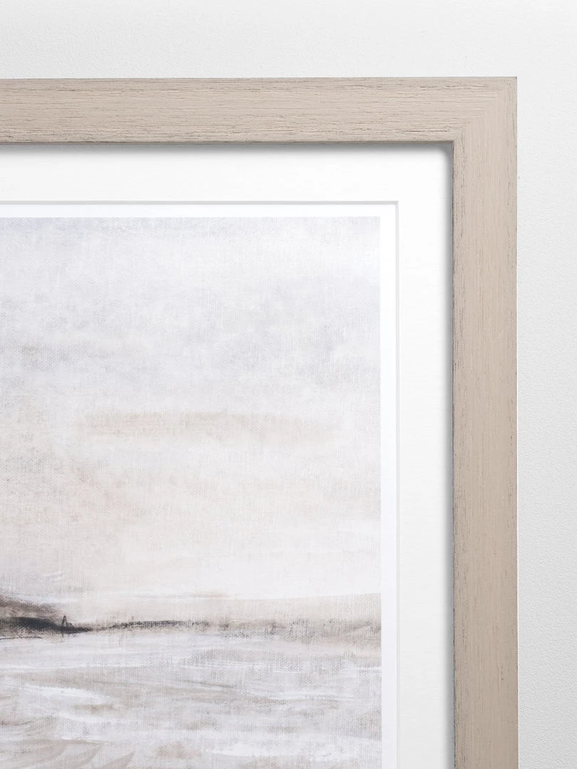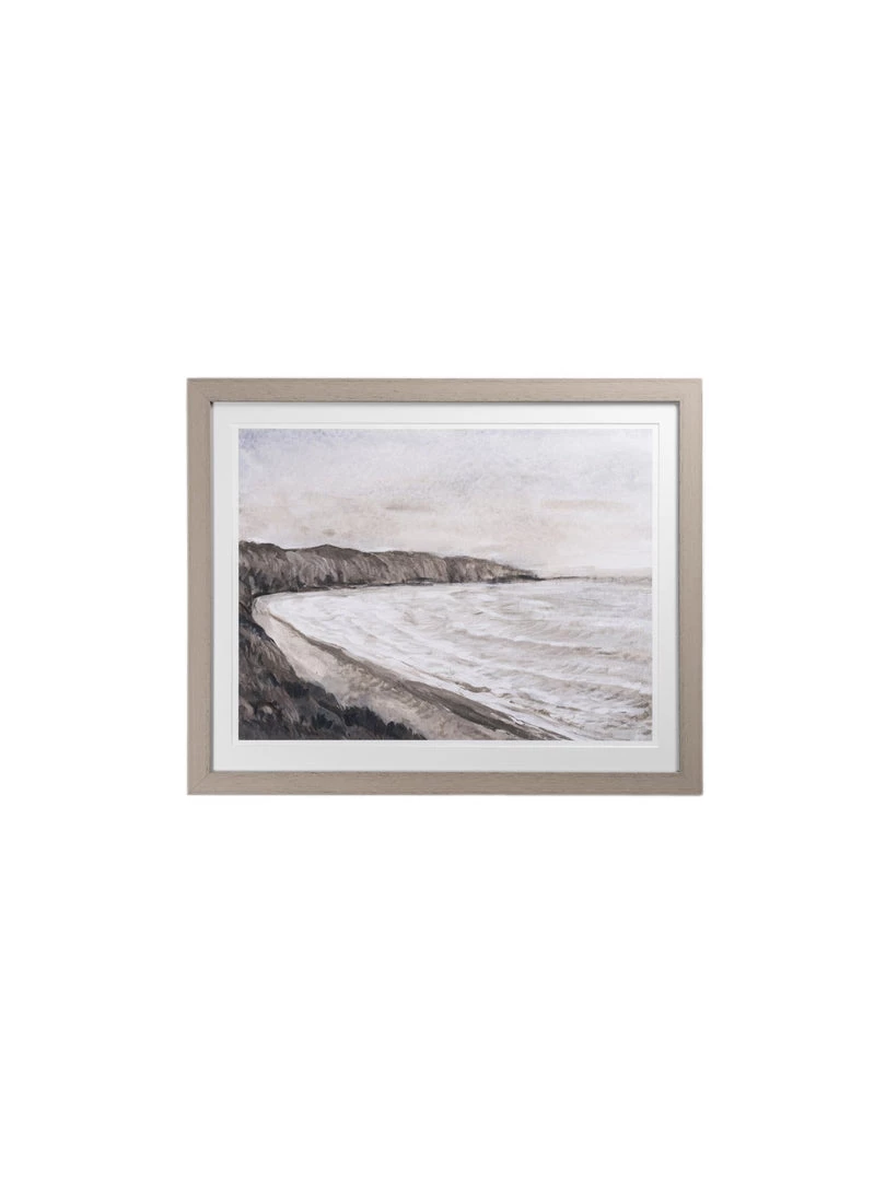 Frame print of a watercolour beach scene, soft white mount with a soft grey wooden frame. Matching picture available.