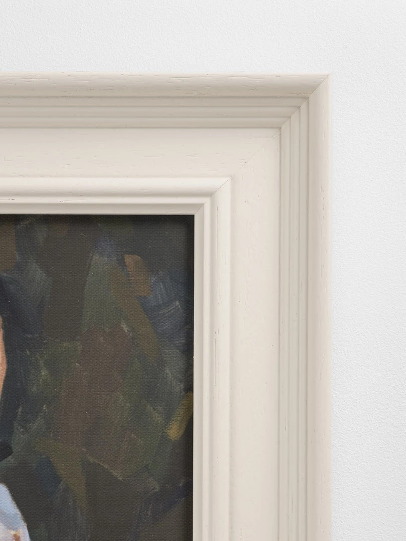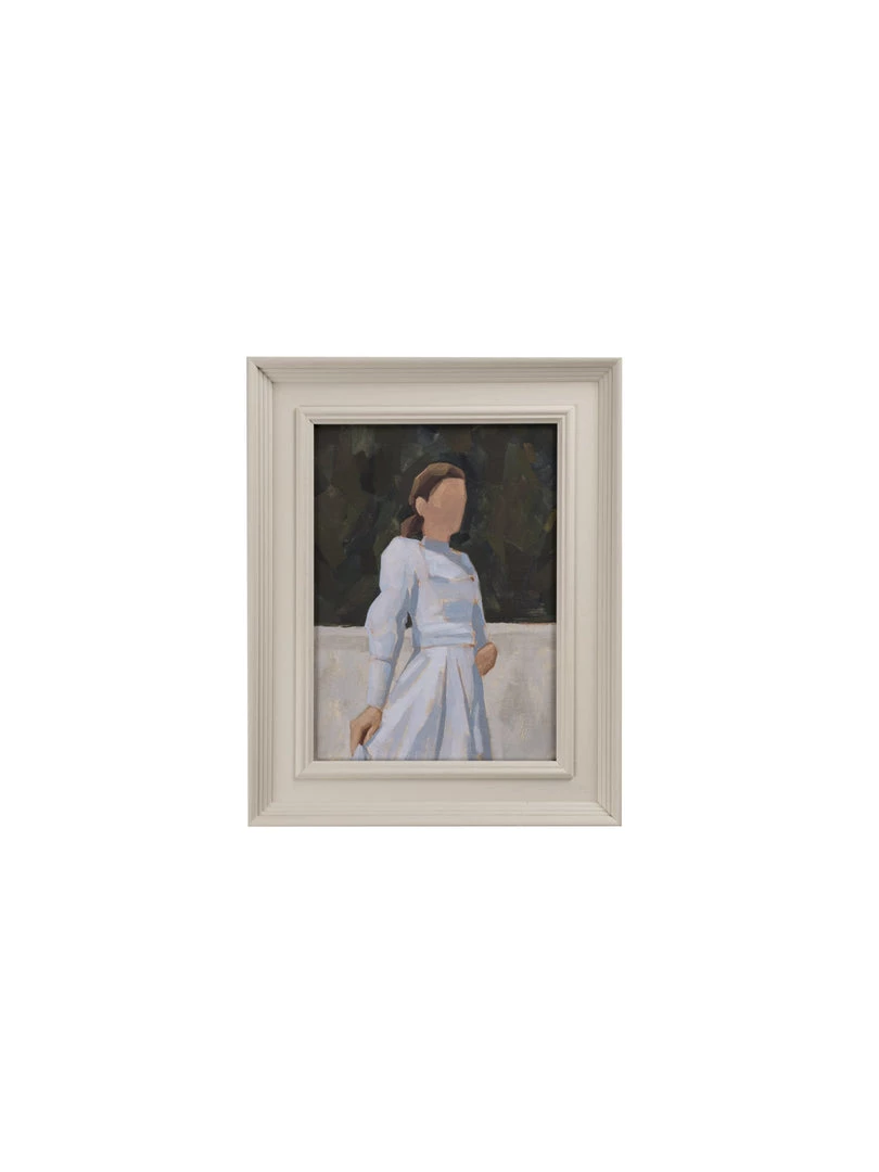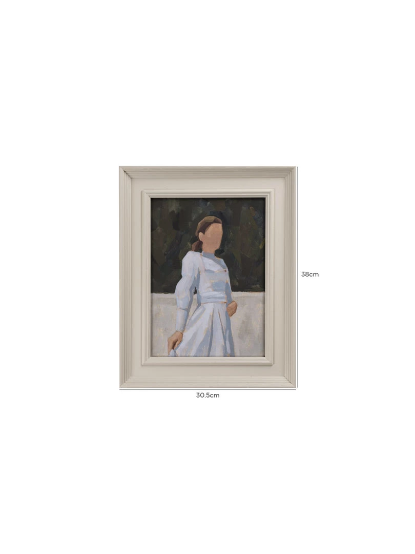 Canvas print of a girl in the garden, framed within large cream junky wooden frame.