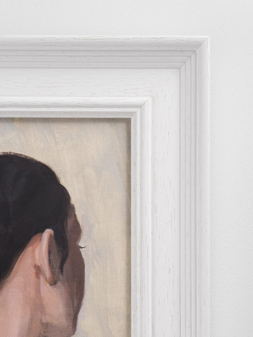 Framed artwork of a Girl with dark brown bun, a canvas print framed in a large cream junky frame.