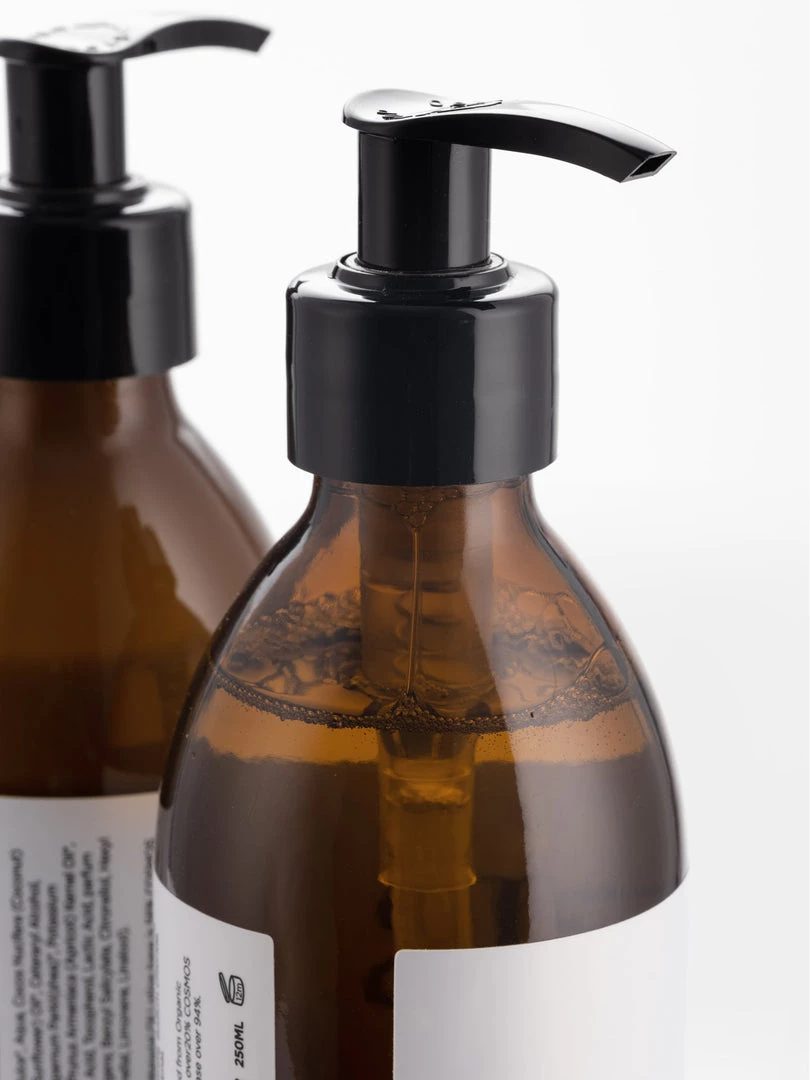 - Brown recyclable glass bottle with pump dispenser