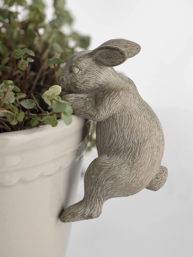 Cute pale grey rabbit that hangs off a plant pot with his front paws – suitable for indoor or outdoors.
