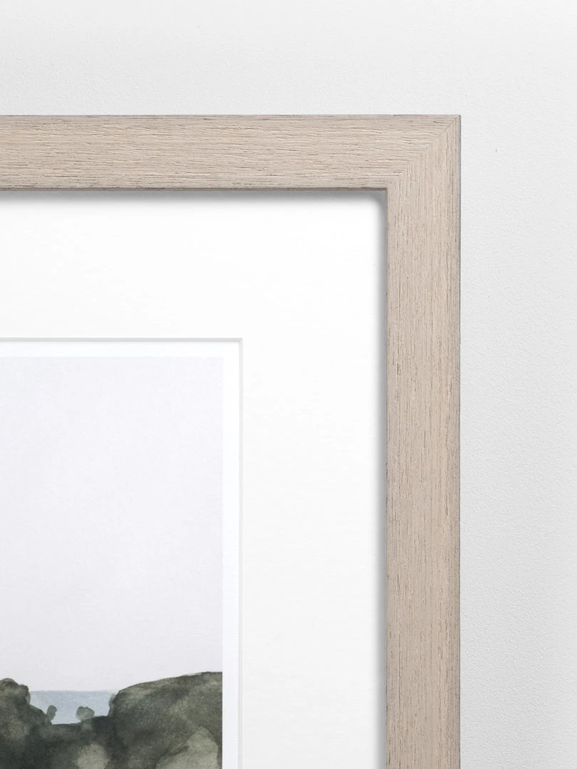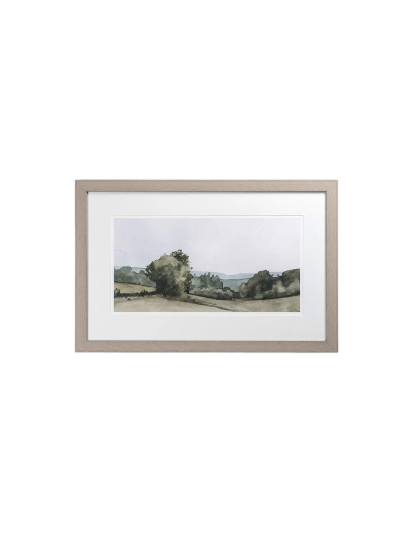 Framed landscape art print of summertime hills, mounted with a soft white mount and framed with a grey oak frame.