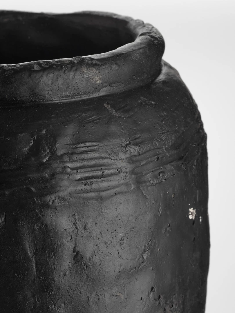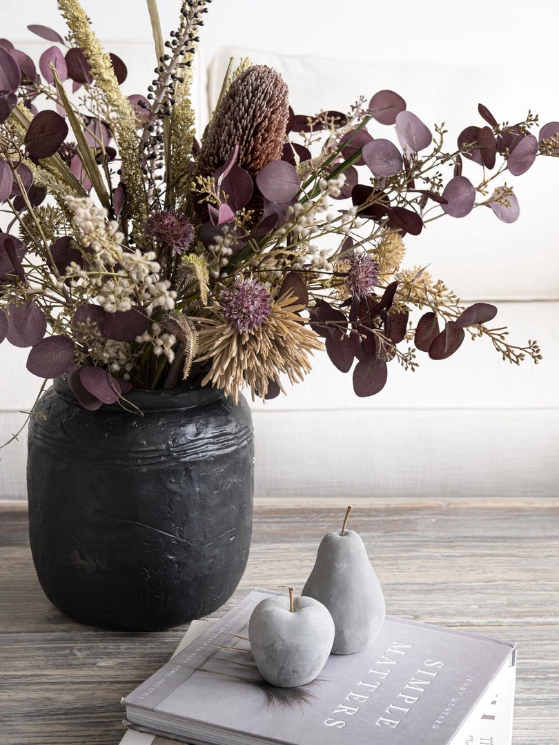 Heavy black cement pot, fill with our burgundy eucalyptus