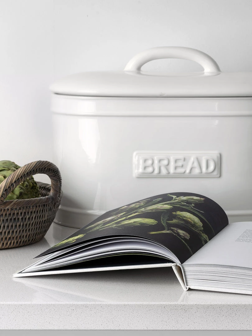 Pure white ceramic bread bin, practical but very stylish adding some storage to your kitchen countertop. Keeps anything from bread to cake fresh.