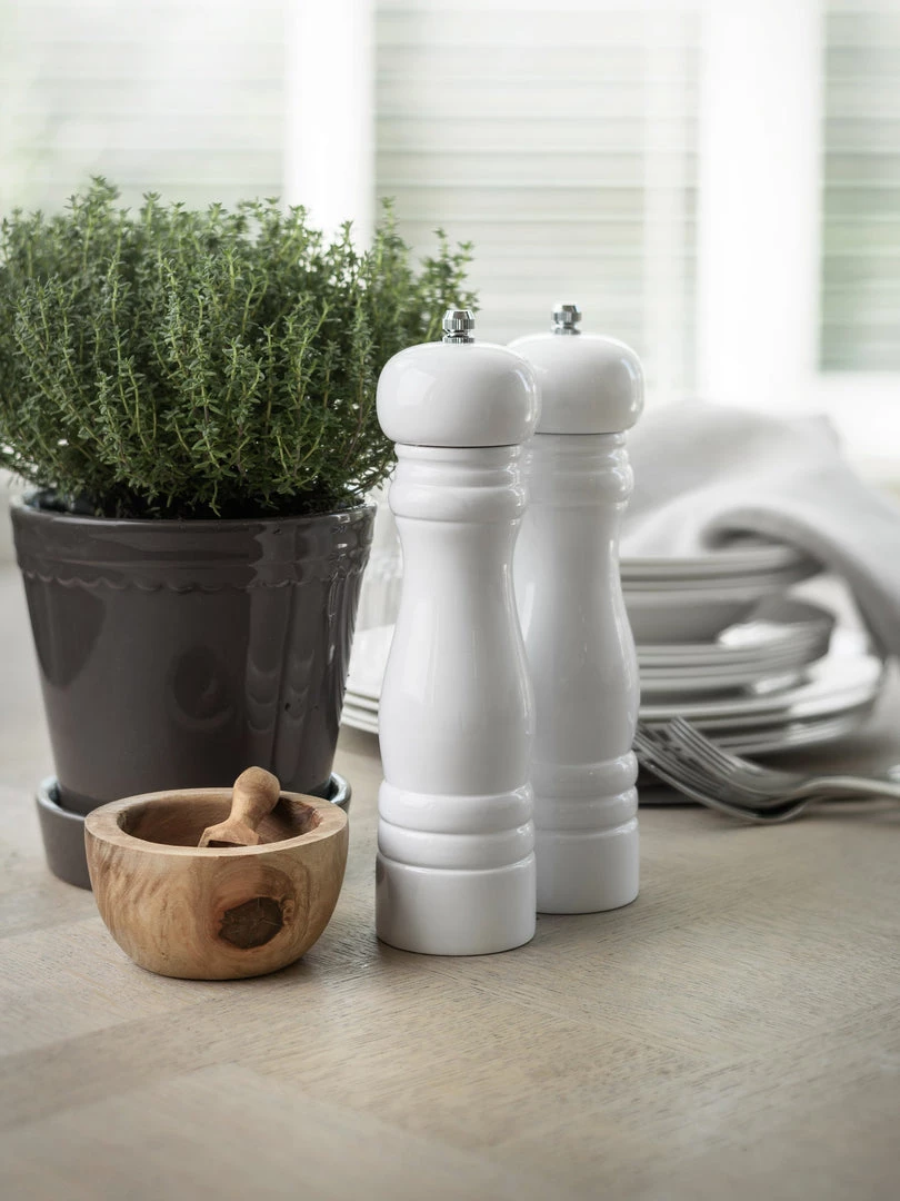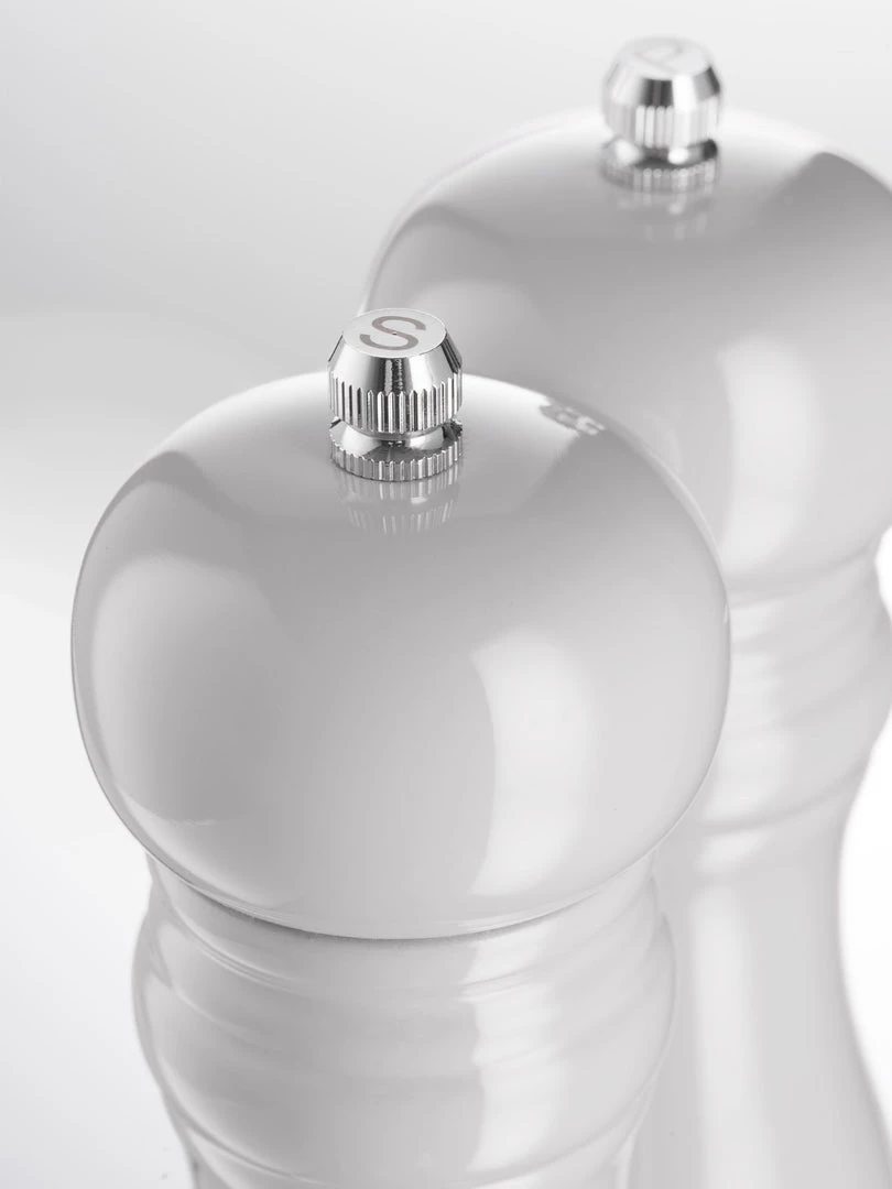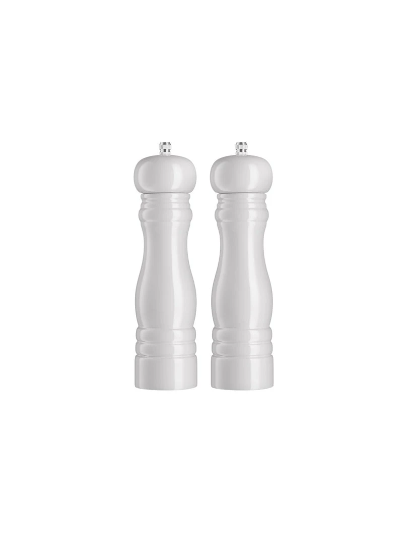 White salt and pepper mills, too nice to put away and definitely good enough to use for formal dining. Classically stylish with intricate ring design and finished in an easy clean gloss finsh. Available also in grey.